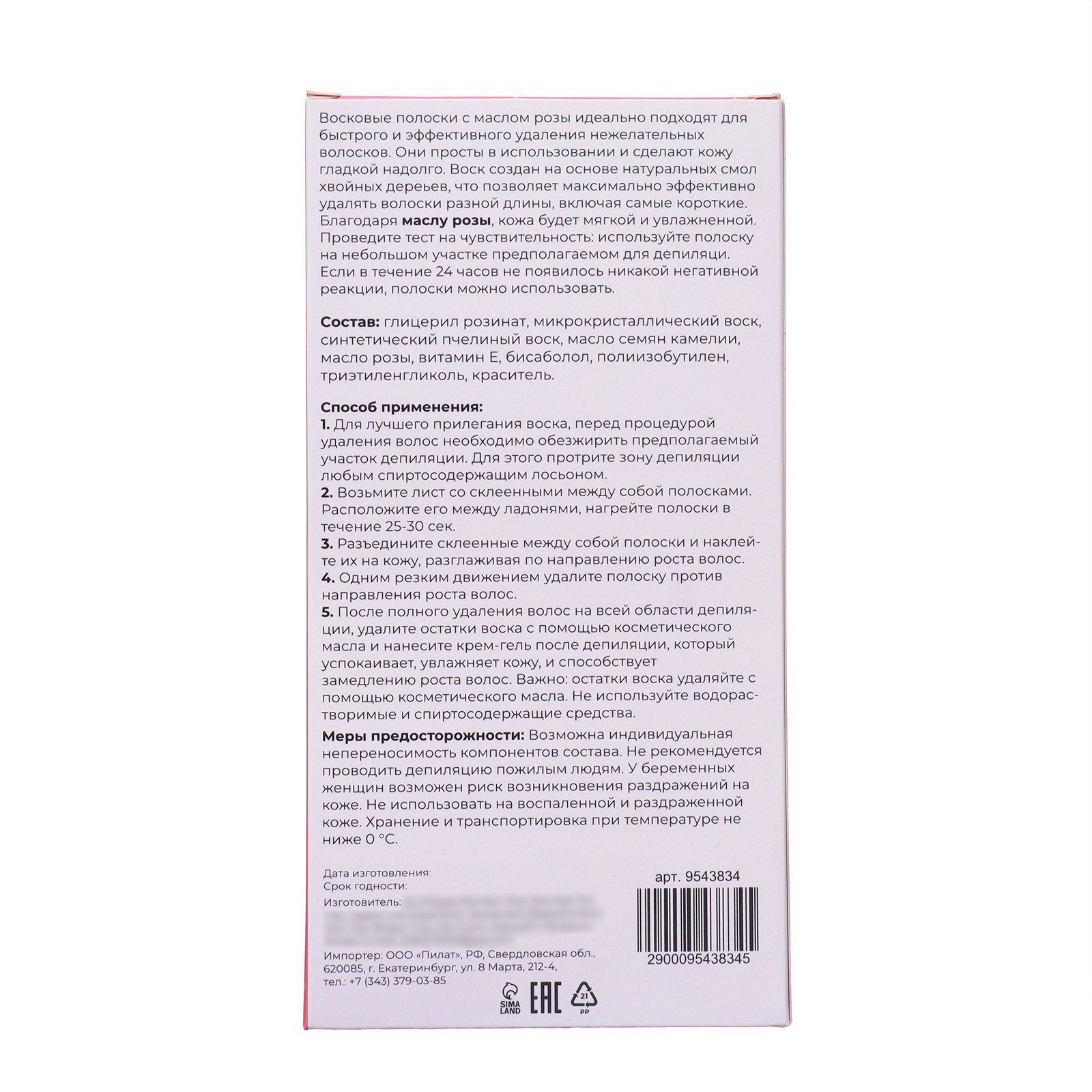 Размер упаковки: 2.5 x 19 x 10 см. Размер упаковки: 2.5 x 19 x 10 см. tnved: 3307900000 В упаковке, шт.: 10 Область применения: Для ног Область применения: Для ног Восковые полоски с маслом розы идеально подходят для быстрого и эффективного удаления нежелательных волосков на любом участке тела. Они просты в использовании и сделают кожу гладкой надолго. Воск создан на основе натуральных смол хвойных дереьев, что позволяет максимально эффективно удалять волоски разной длины, включая самые короткие. Благодаря экстракту масла розы и витамина Е, кожа будет мягкой и увлажненной. Проведите тест на чувствительность: используйте полоску на небольшом участке предполагаемом для депиляци. Если в течение 24 часов не появилось никакой негативной реакции, полоски можно использовать. Состав: глицерил розинат, микрокристаллический воск, синтетический пчелиный воск, масло семян камелии, масло розы, витамин Е, бисаболол, полиизобутилен, триэтиленгликоль, краситель. Способ применения: