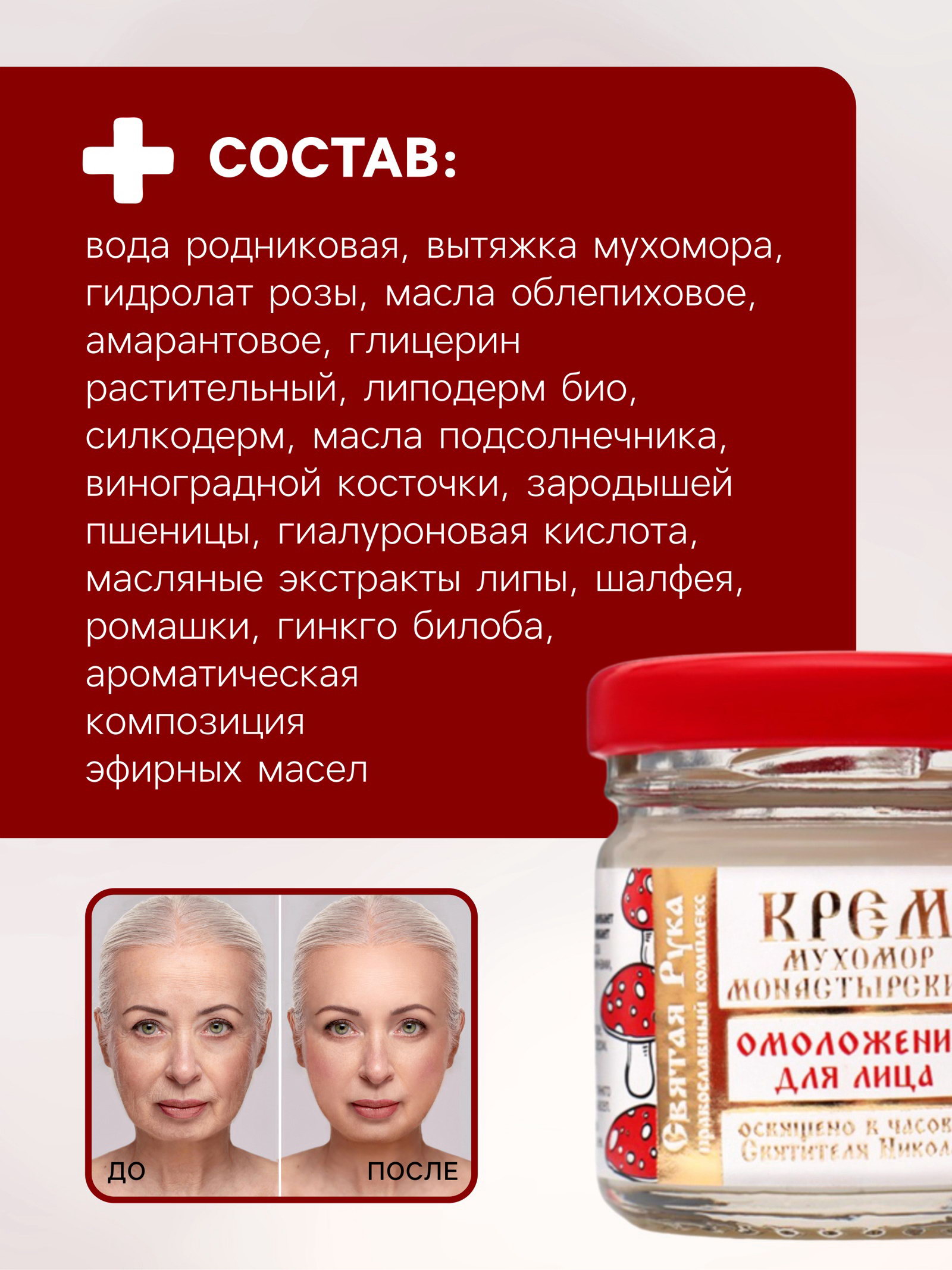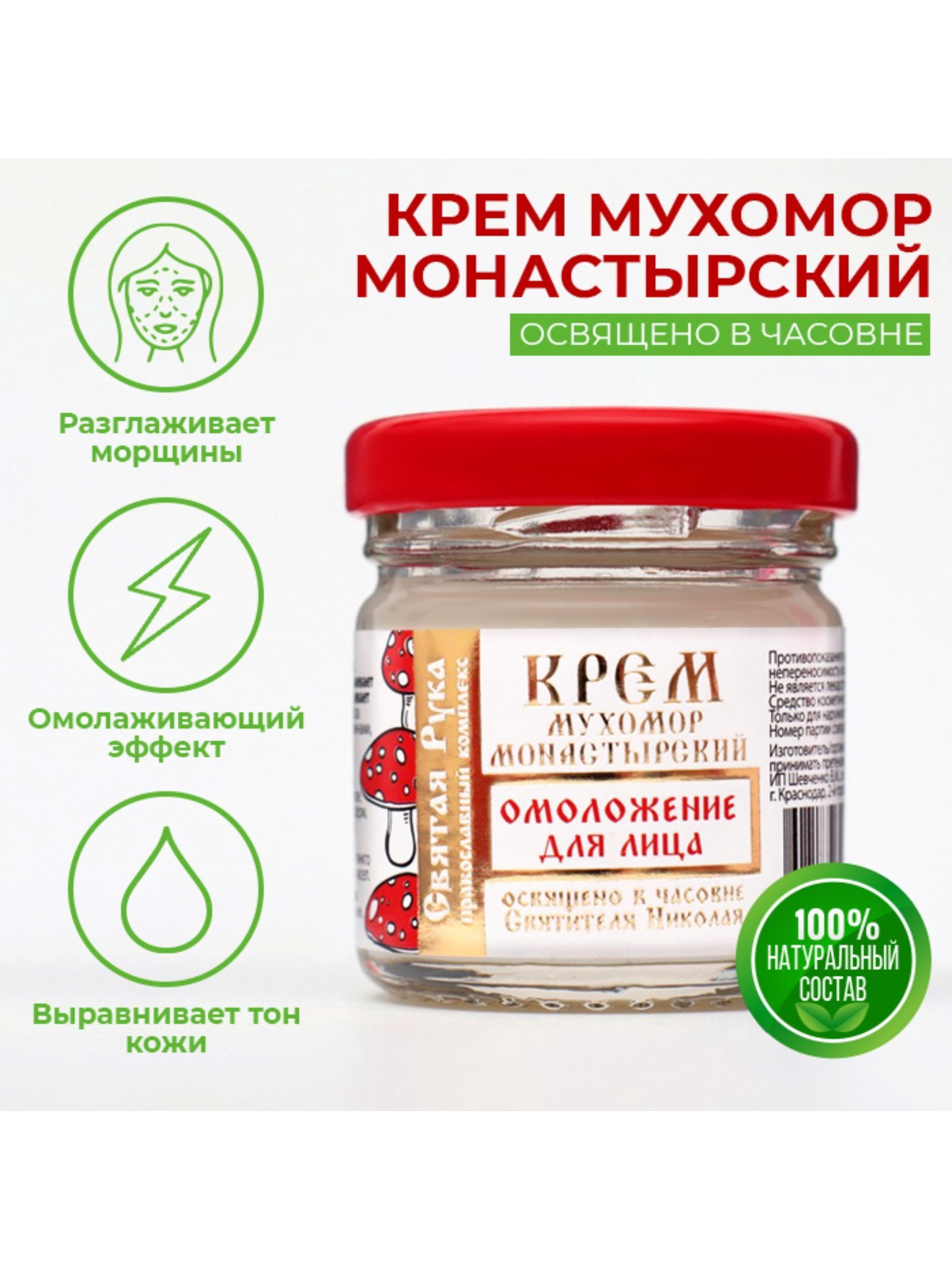 Крем для лица монастырский Омолаживающий "Святая рука" Мухомор, 30 мл, Святая Рука, Россия