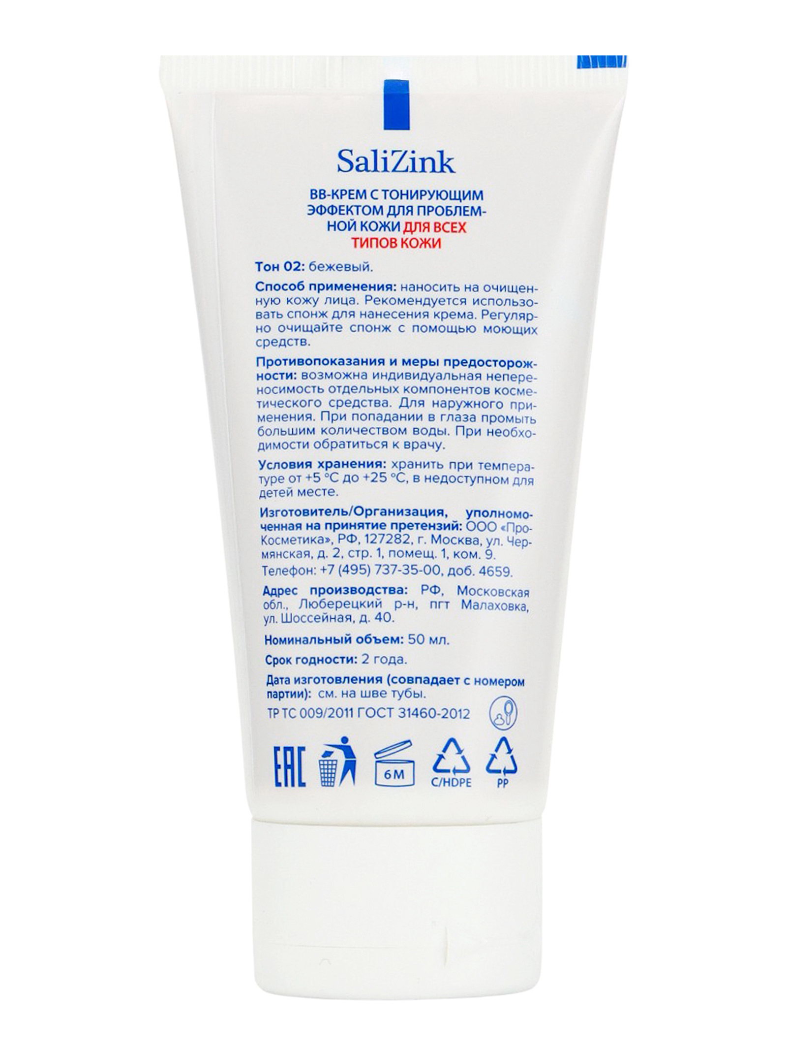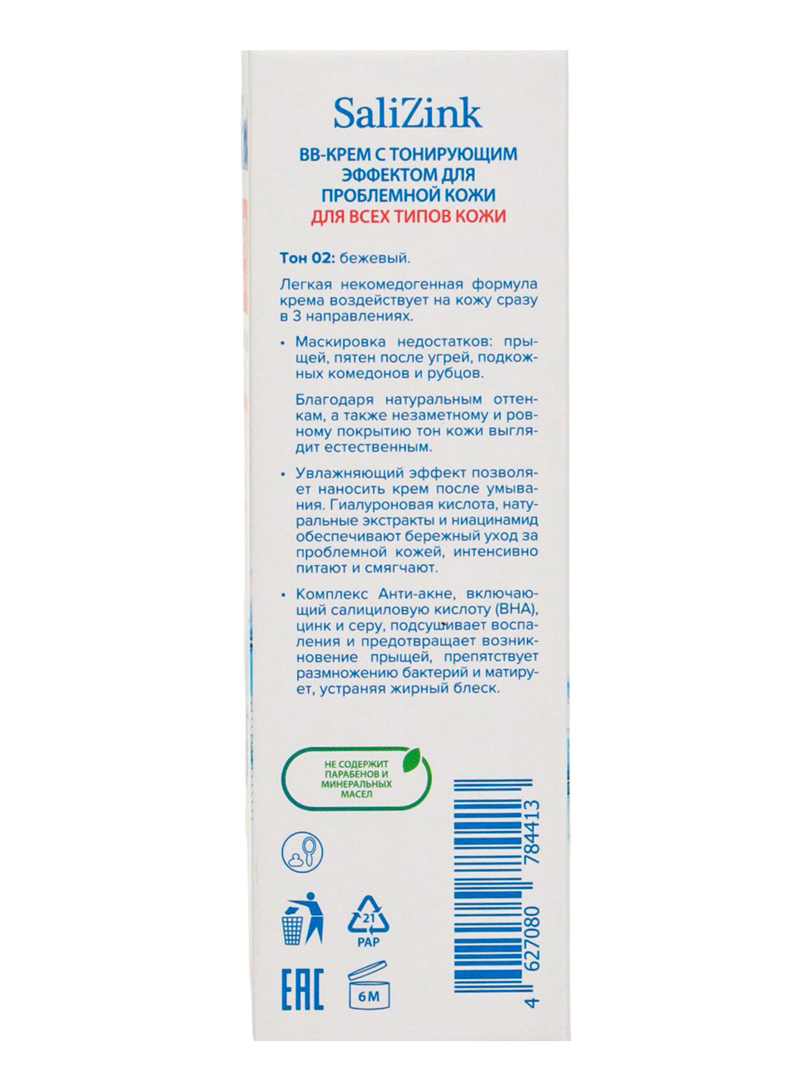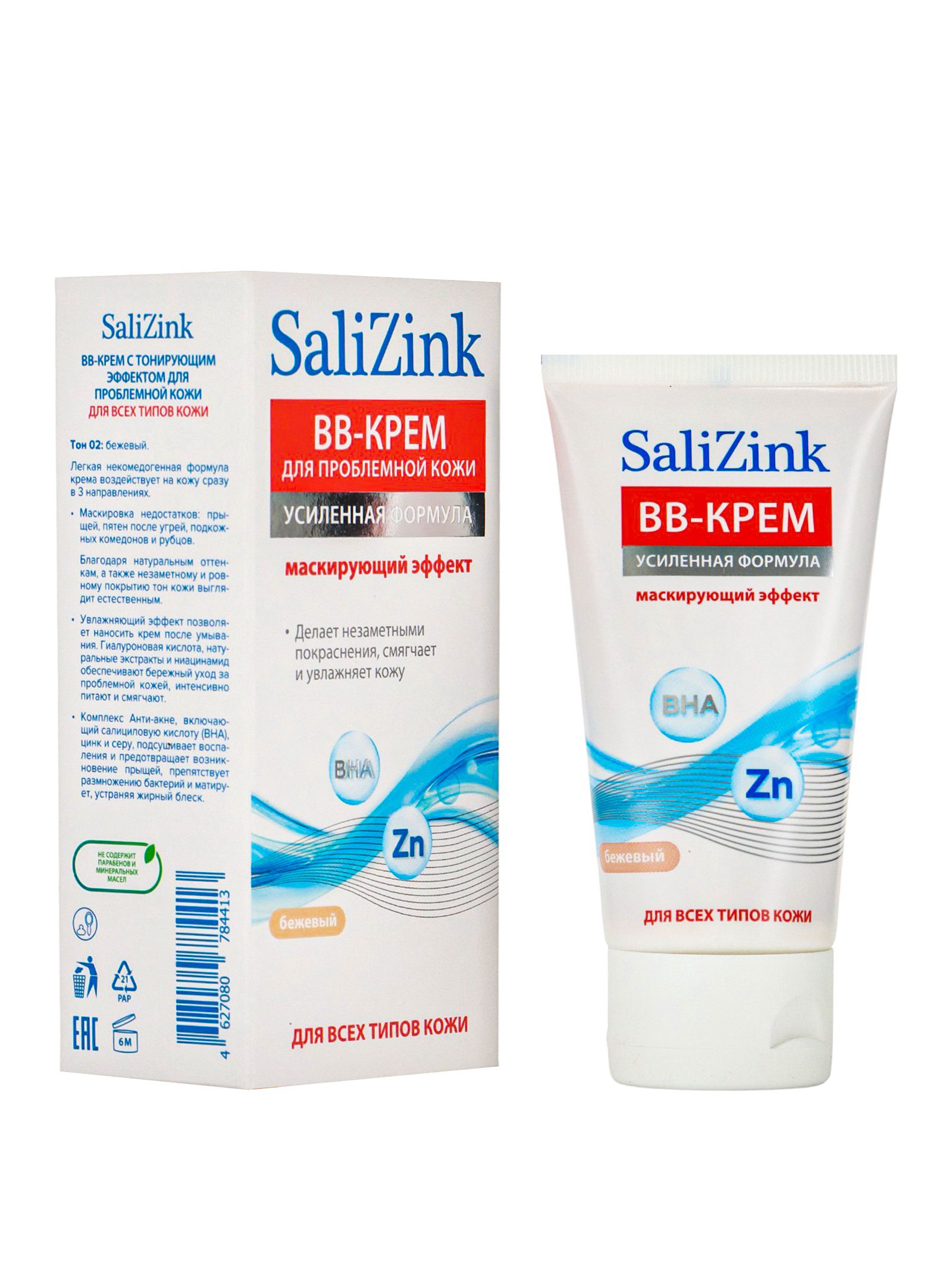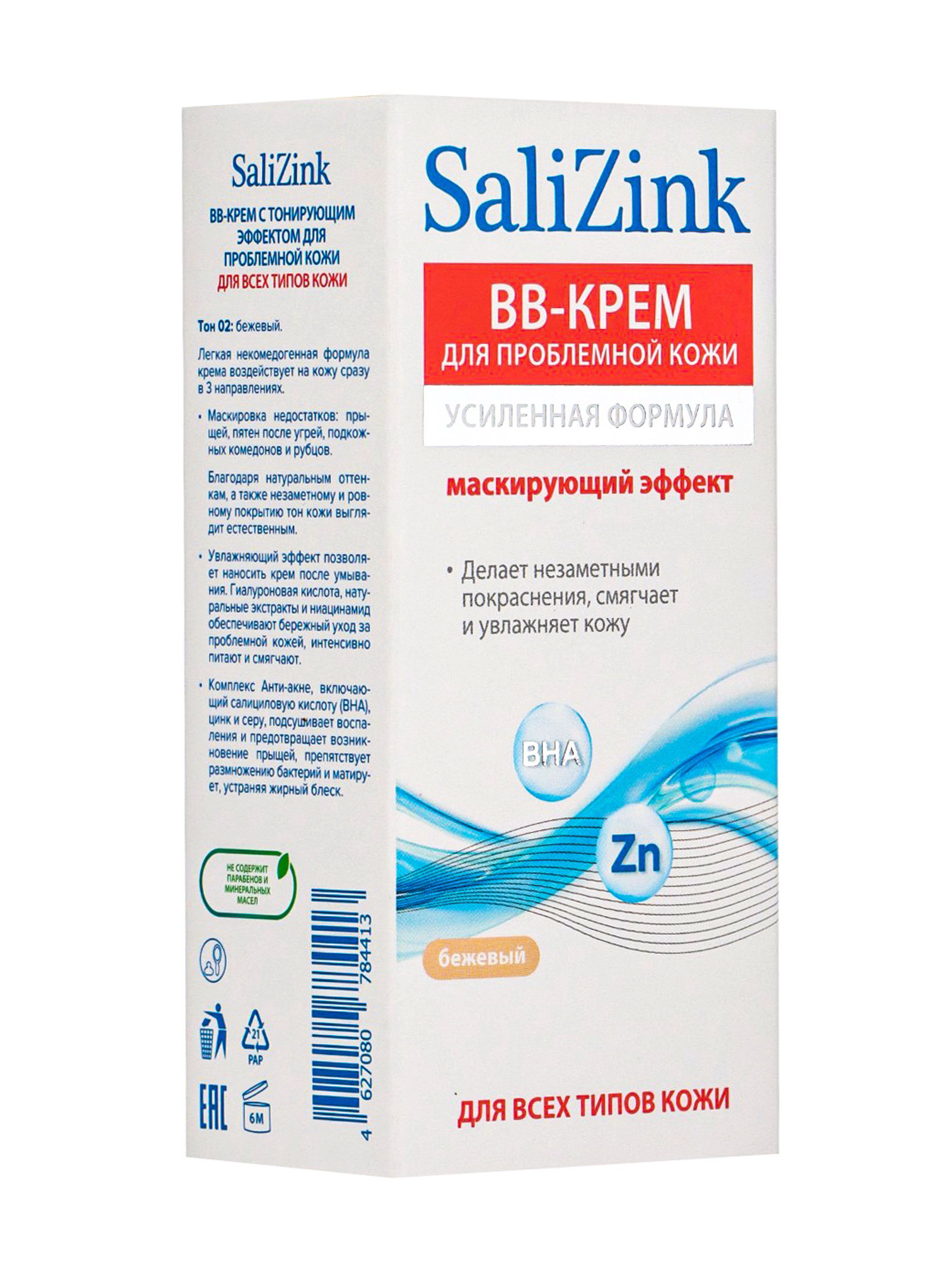 Крем-BB "САЛИЦИНК", для всех типов кожи, с тонирующим эффектом, тон 02 бежевый, 50 мл, SaliZink, Россия
