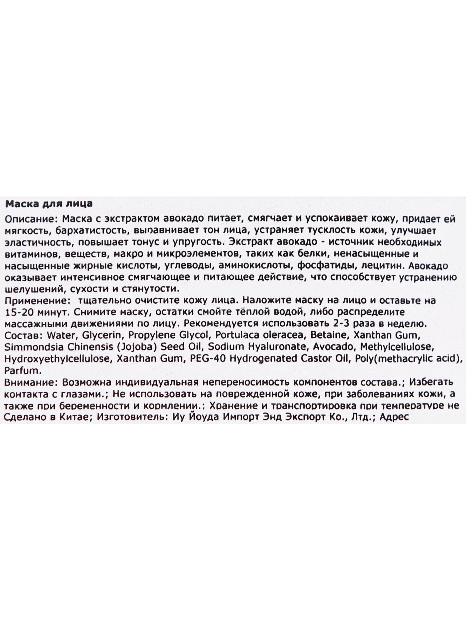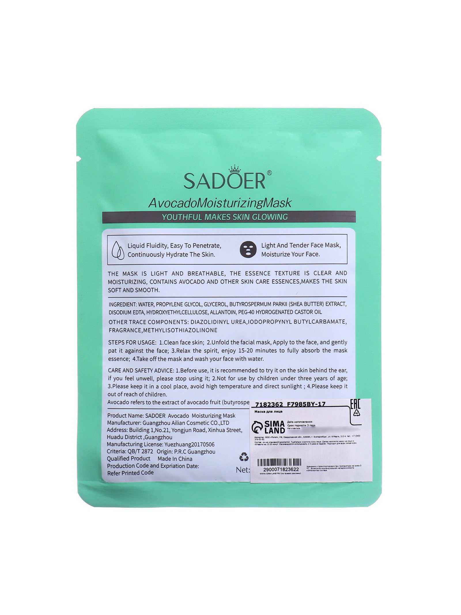 Тканевая маска для лица с авокадо, увлажняющая, 11x16x0.5 см., SADOER, Китай