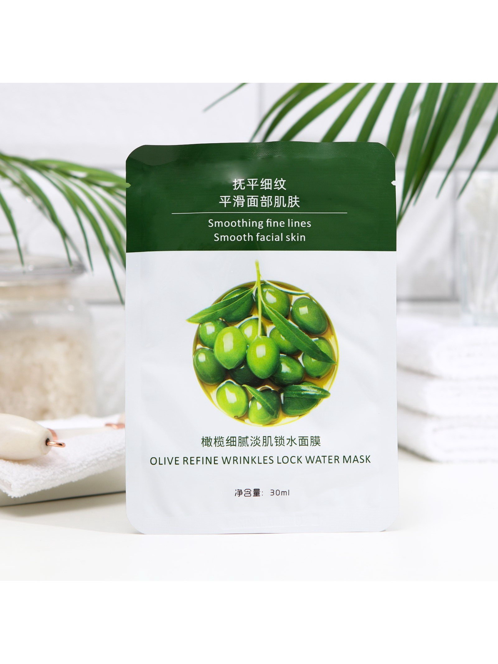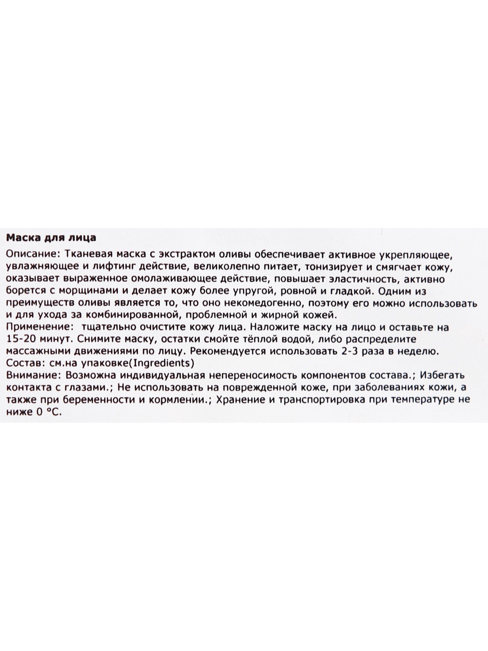 Тканевая маска для лица с экстрактом оливы, увлажняющая, 11x16x0.5 см., Китай