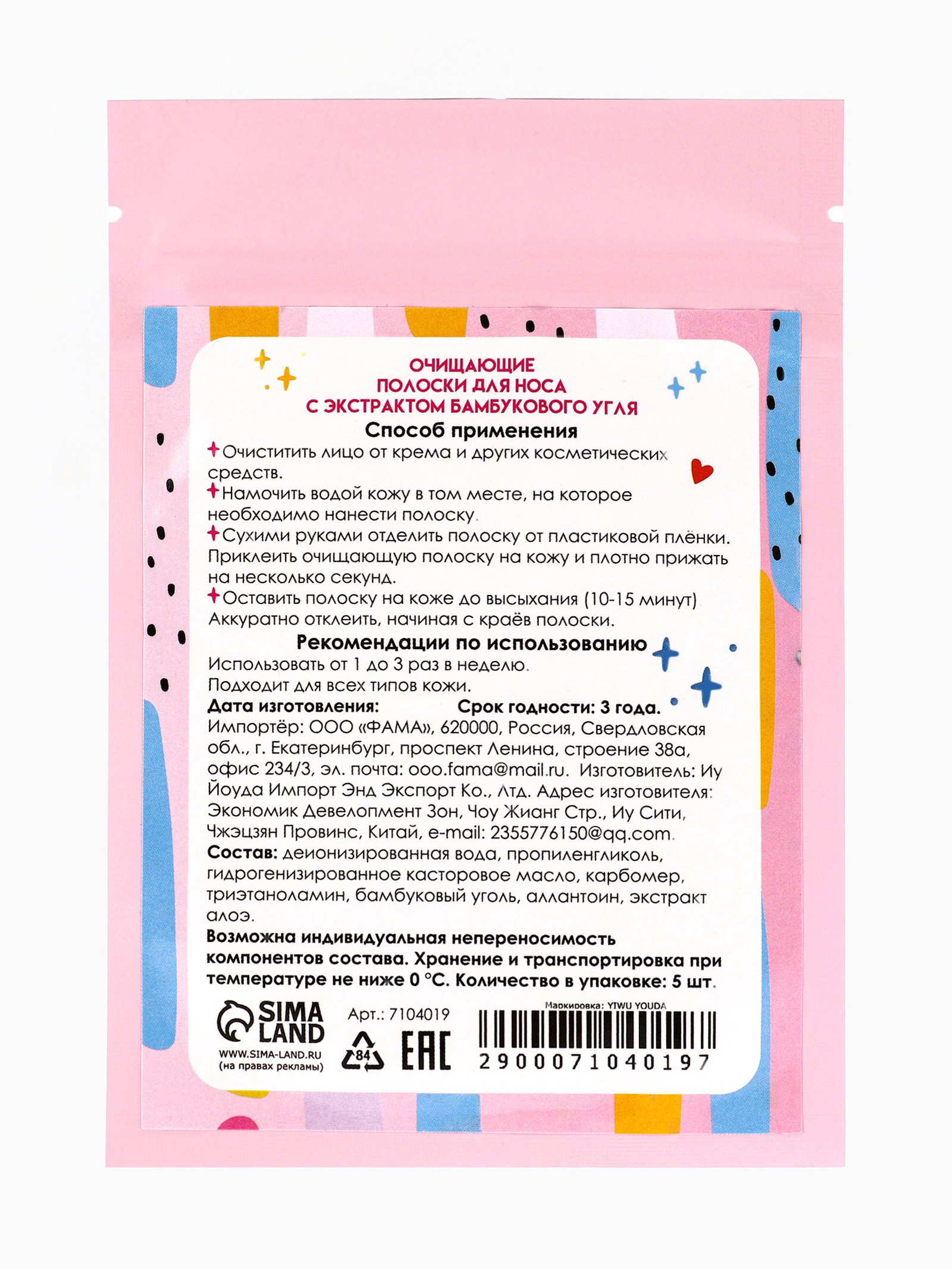 Размер упаковки: 9 x 0.1 x 13 см. Набор: Да tnved: 3304990000 Область применения: Для носа Тип маски: Полоски для носа Назначение: Очищение, детокс Тип кожи: Для всех типов Очищающая полоска для носа с экстрактом бамбукового угля: