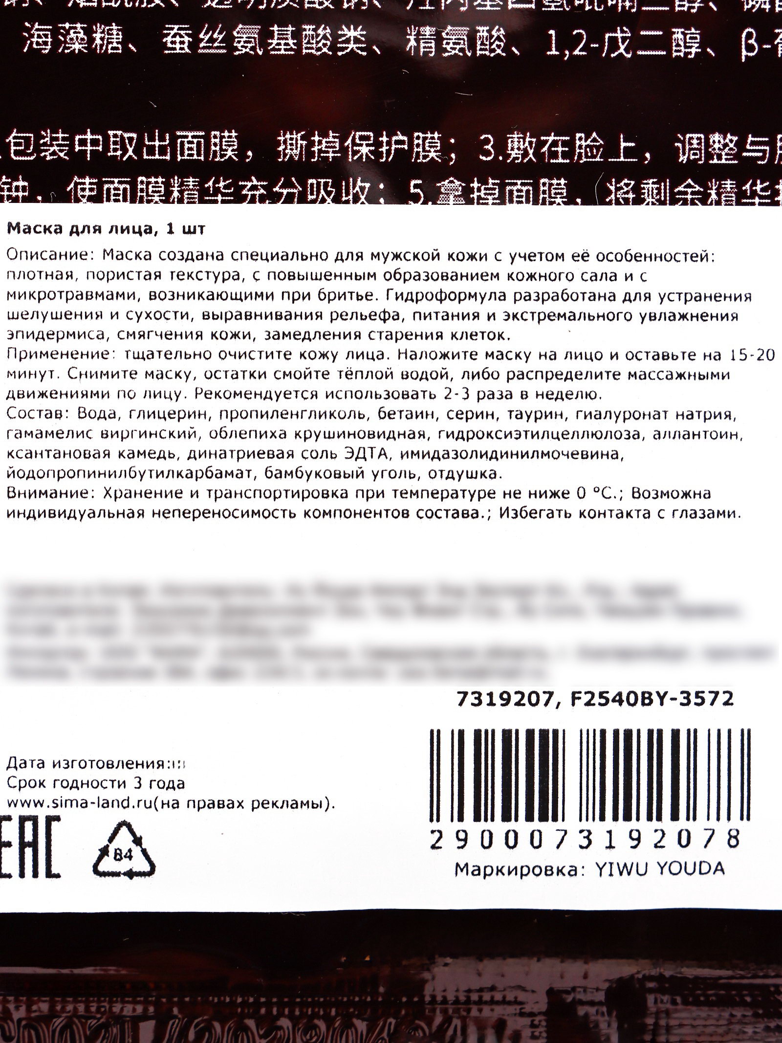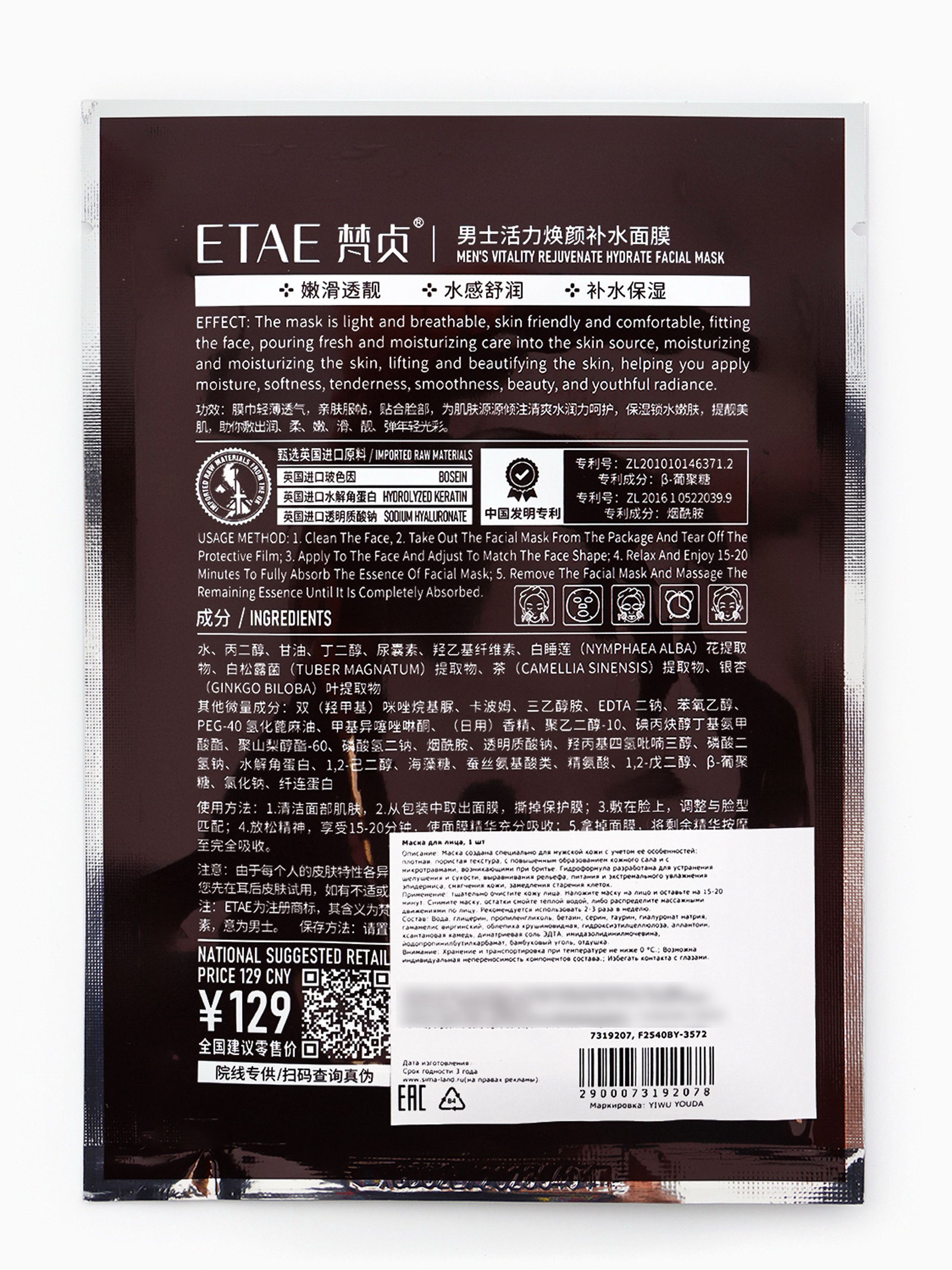 Увлажняющая тканевая маска для мужчин, 10x15x0.5 см., Китай