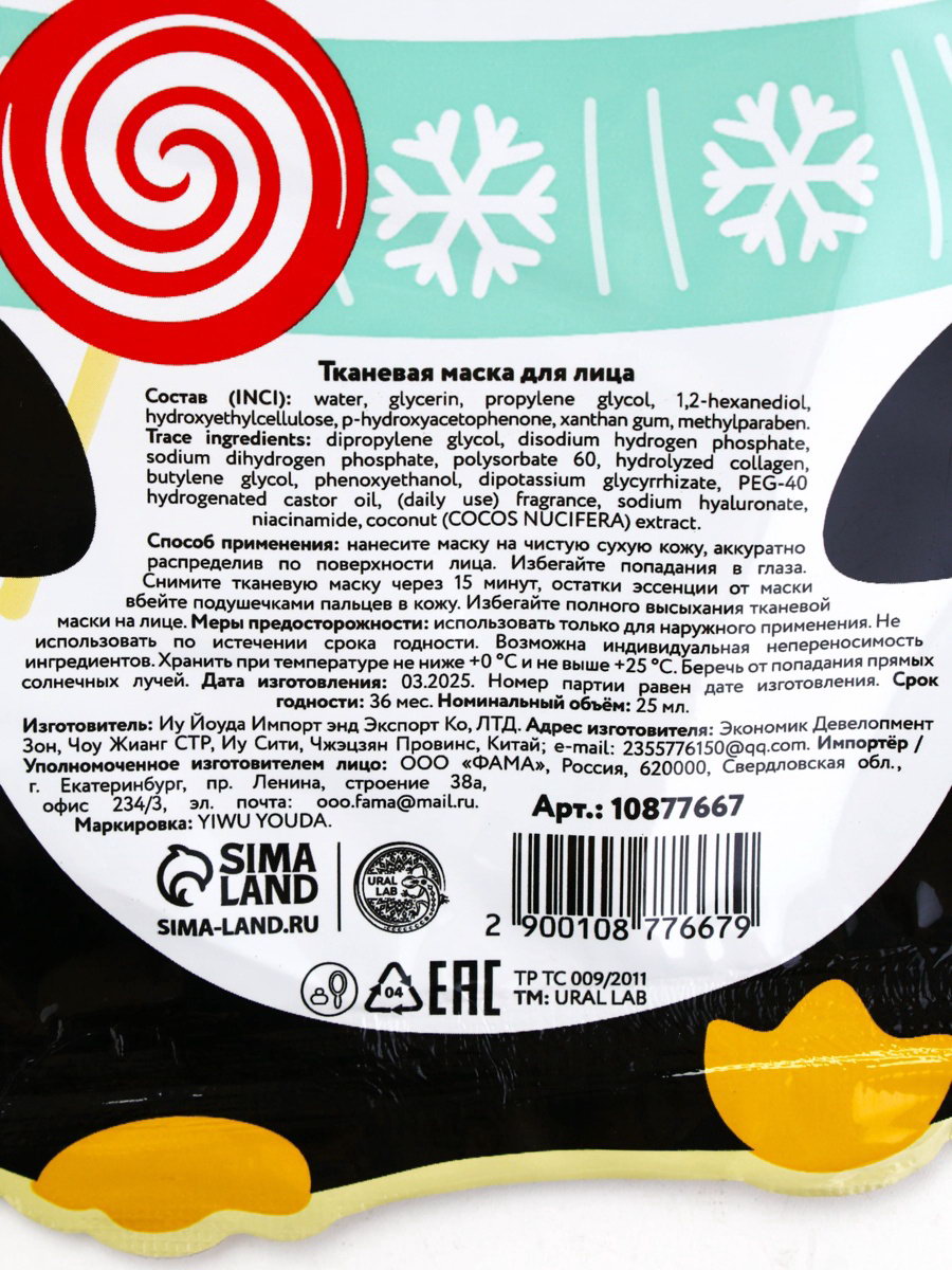 Тканевая маска для лица насыщающая, экстракт кокоса и гиалуроновая кислота, URAL LAB, Китай