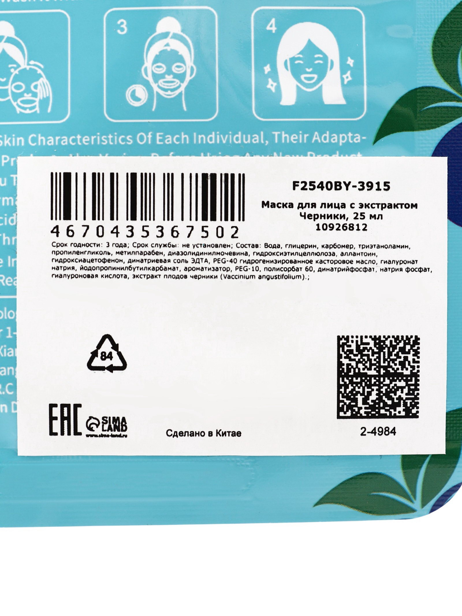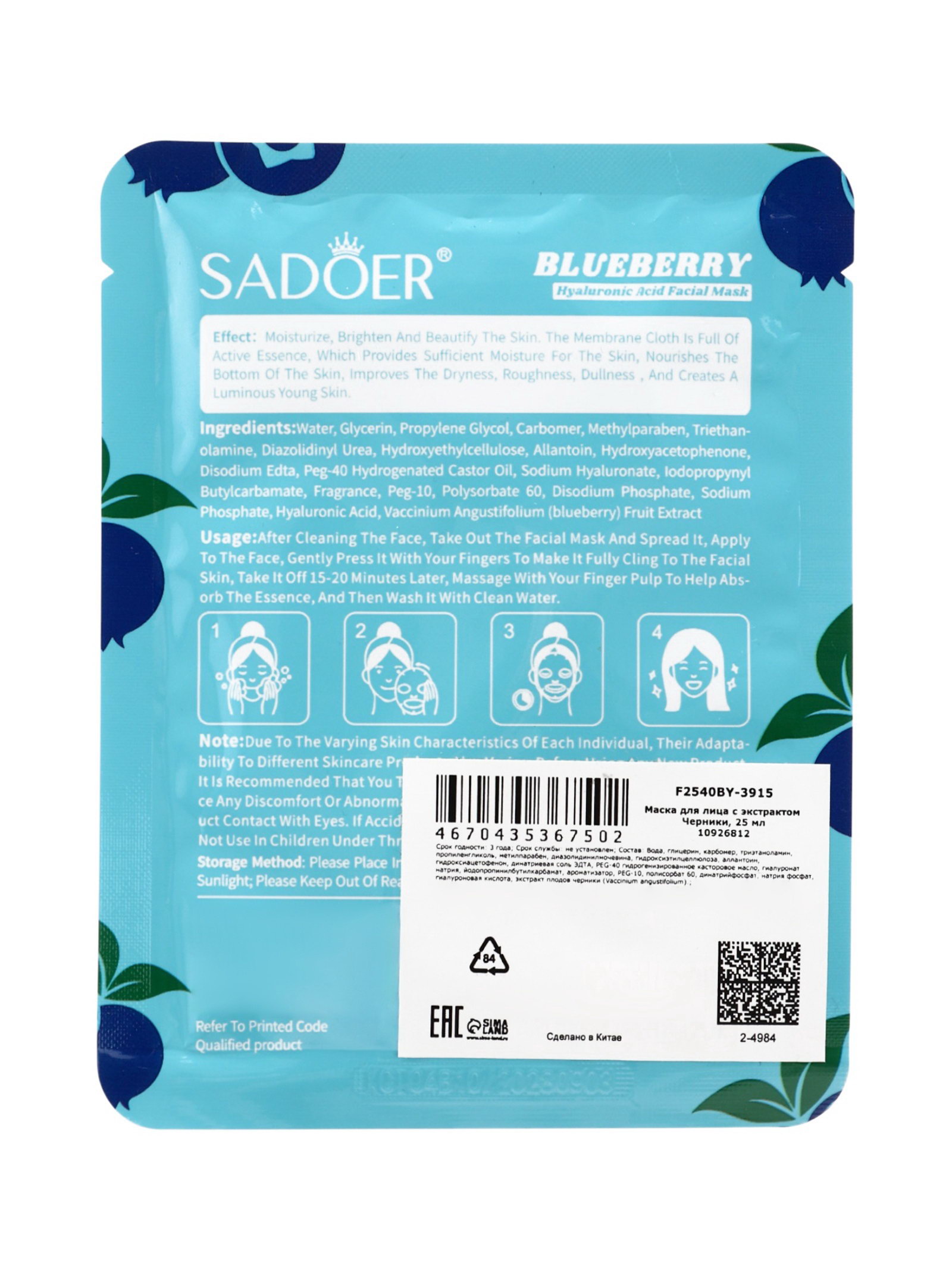 Маска тканевая увлажняющая для лица c экстрактом черники, 25 мл, SADOER, Китай