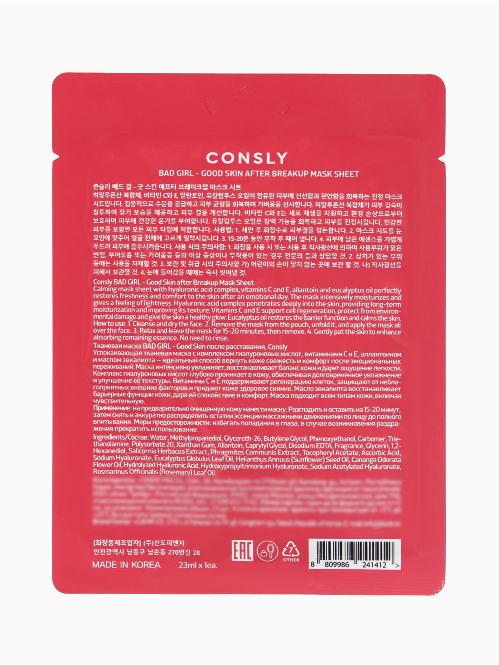 Рекомендуется использовать 2–3 раза в неделю или по мере необходимости. Consly "После расставания" это не просто тканевая маска, а маленький ритуал заботы о себе, который помогает коже успокоиться, восстановиться и снова выглядеть свежей и ухоженной. | ||