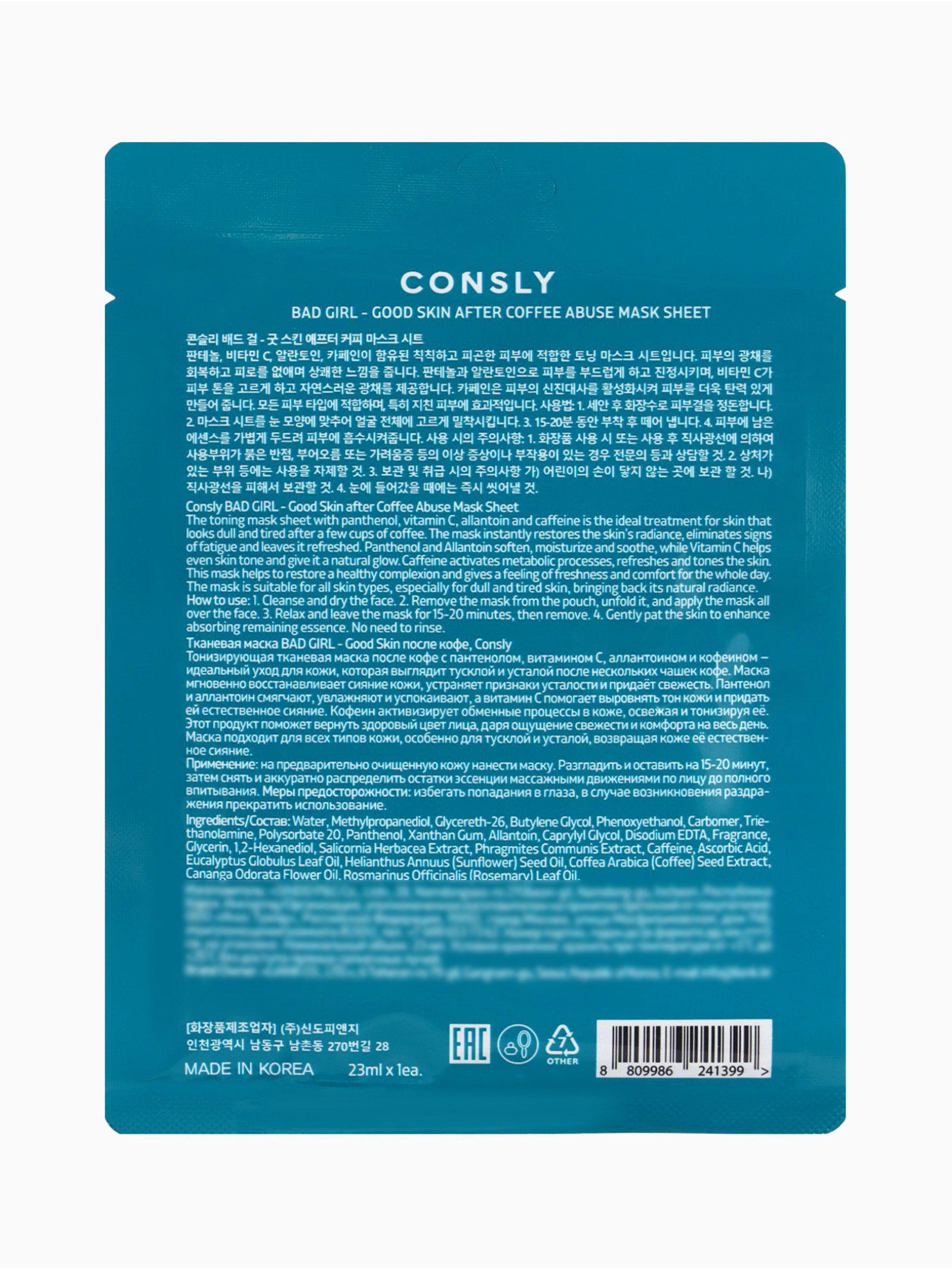 Тканевая маска тонизирующая "После кофе", 23 мл, Consly, Южная Корея