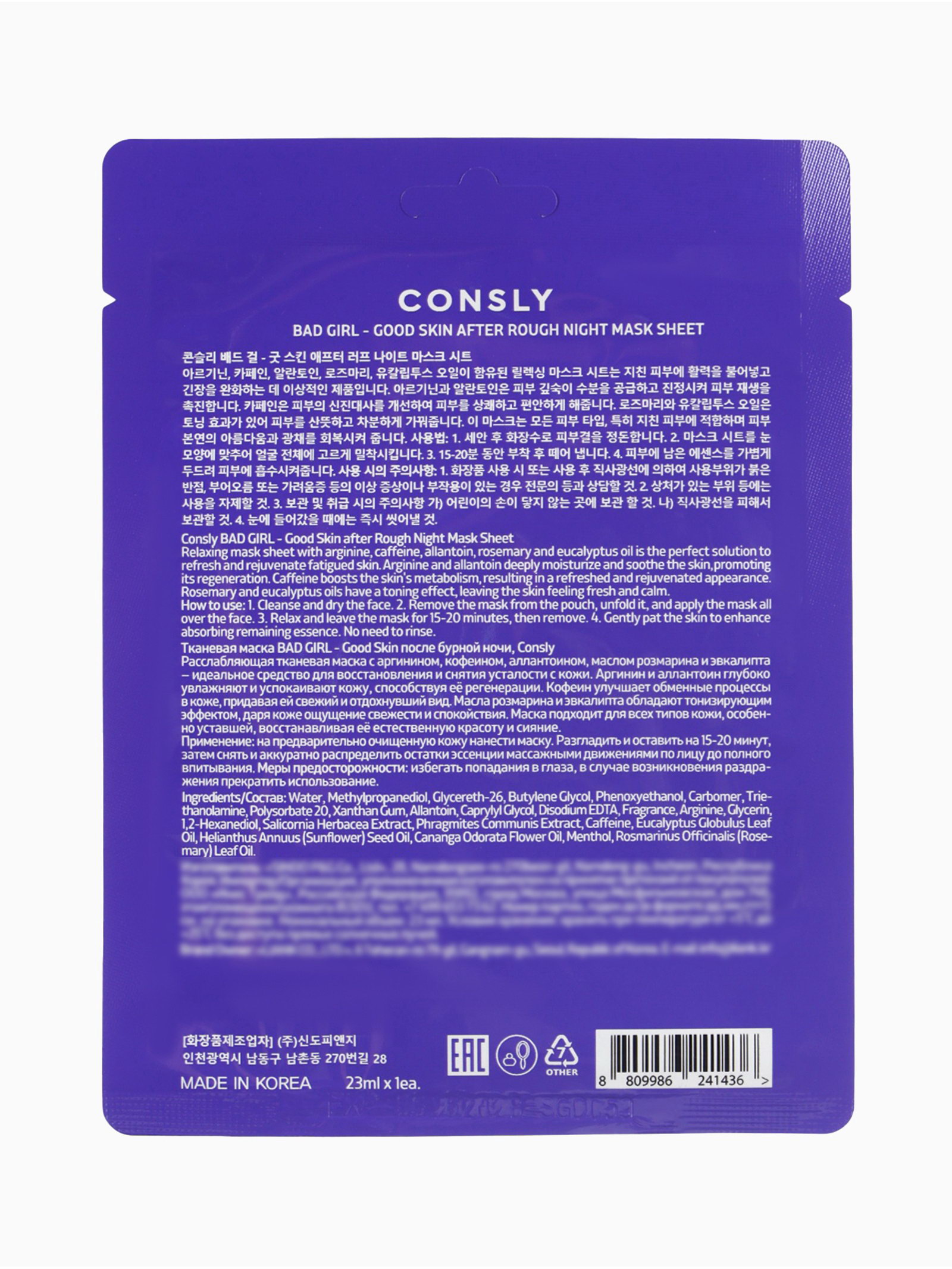 Размер упаковки: 12 x 0.1 x 16 см. tnved: 3304990000 Температурное ограничение: Нет Набор: Нет Тип кожи: Для всех типов Тип маски: Тканевая Область применения: Для лица Назначение: Успокаивающая Тканевая маска Consly "Восстановление и снятие усталости с кожи" предназначена для интенсивного ухода за уставшей, напряжённой и потерявшей тонус кожей. Это средство помогает быстро снять признаки усталости, восстановить естественное сияние и вернуть коже ощущение комфорта после стресса, тяжёлого дня или длительного воздействия внешних факторов. Маска входит в серию Bad Girl Good Skin, созданную для решения конкретных проблем кожи, связанных с переутомлением и снижением жизненной энергии. Активные компоненты маски включают аргинин, аллантоин, кофеин, розмарин и эвкалиптовое масло. Эти ингредиенты работают в комплексе: глубоко увлажняют кожу, стимулируют микроциркуляцию, улучшают тонус и способствуют восстановлению естественного баланса. Аргинин и аллантоин обеспечивают увлажнение и успокаивающий эффект, кофеин улучшает обменные процессы в коже, а экстракты розмарина и эвкалипта оказывают тонизирующее действие и придают коже ощущение свежести. Маска подходит для всех типов кожи, но особенно эффективна для тусклой, усталой и обезвоженной кожи, которой требуется дополнительный уход и восстановление естественного здорового вида. Эффекты после применения