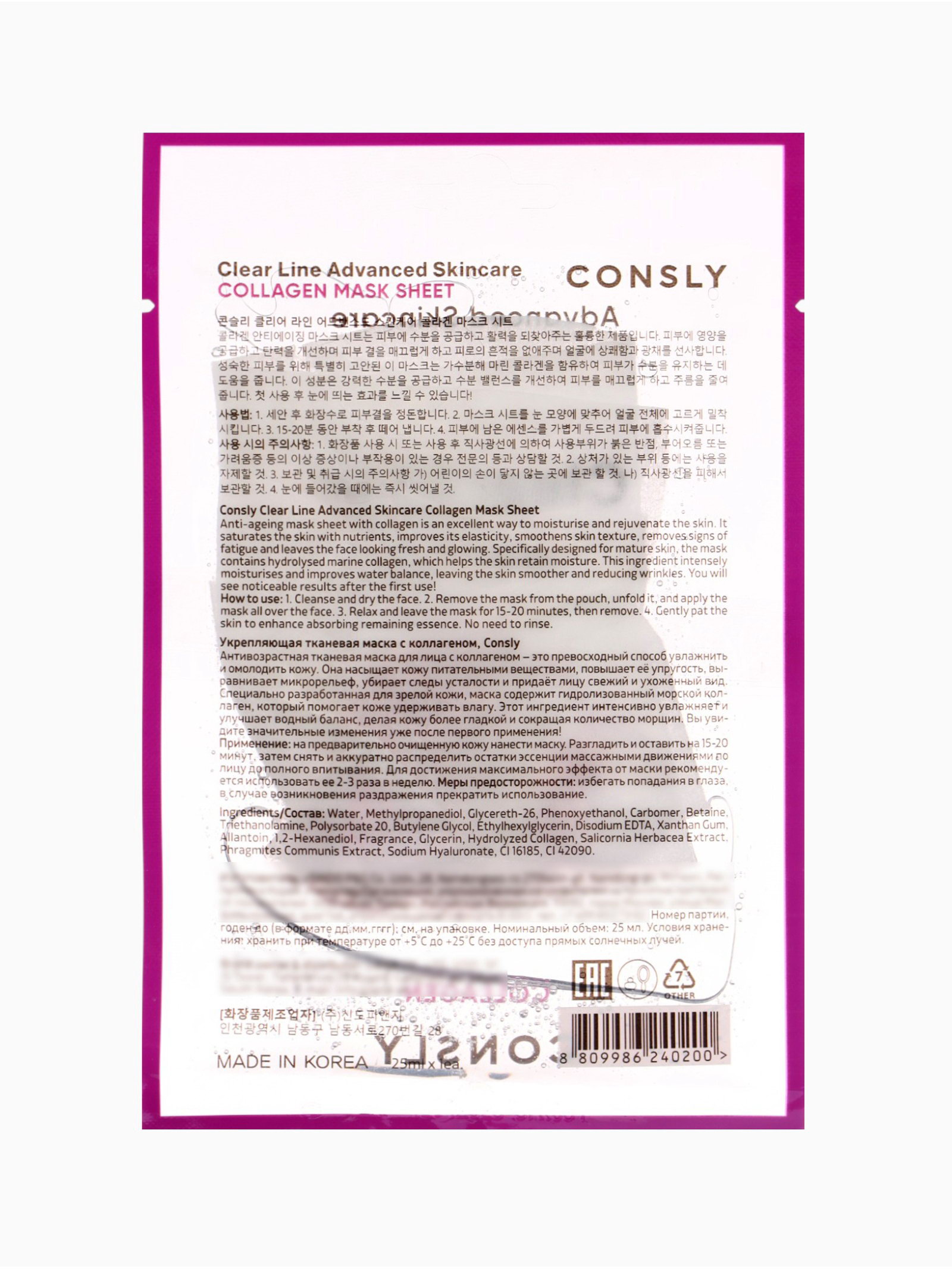 Тип кожи: Для всех типов, Зрелая Размер упаковки: 12 x 0.1 x 16 см. tnved: 3304990000 Температурное ограничение: Нет Область применения: Для лица Набор: Нет Тип маски: Тканевая Назначение: Антивозрастная Тканевая маска Consly "С коллагеном" это средство для антивозрастного ухода, направленное на восстановление упругости, улучшение эластичности и общее омоложение кожи лица. Маска обогащена гидролизованным морским коллагеном, который содержит аминокислоты, способствующие насыщению кожи влагой, повышению её упругости и более гладкой текстуре. За счёт этого кожа выглядит более молодой, упругой и напитанной после применения. Коллаген также помогает уменьшить выраженность мелких морщин и сгладить микрорельеф кожи, придавая лицу ухоженный и свежий вид. Маска подходит для всех типов кожи, особенно для тех, кто хочет поддержать молодость кожи, повысить её упругость и стимулировать естественную регенерацию клеток. Регулярное использование маски может помочь восстановить водный баланс, улучшить тонус кожи и уменьшить признаки возрастных изменений. Способ применения