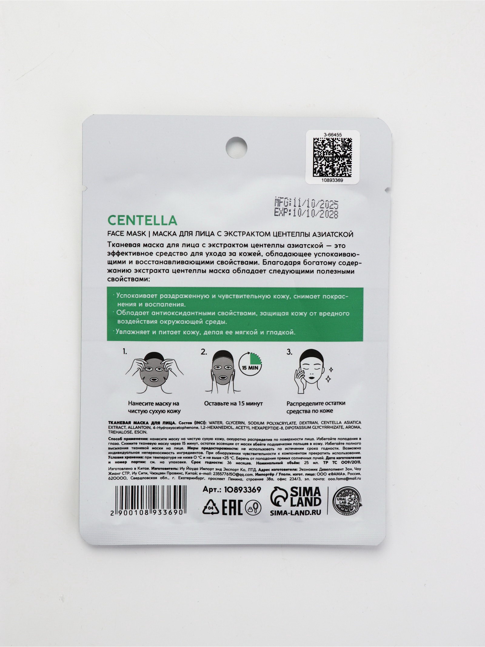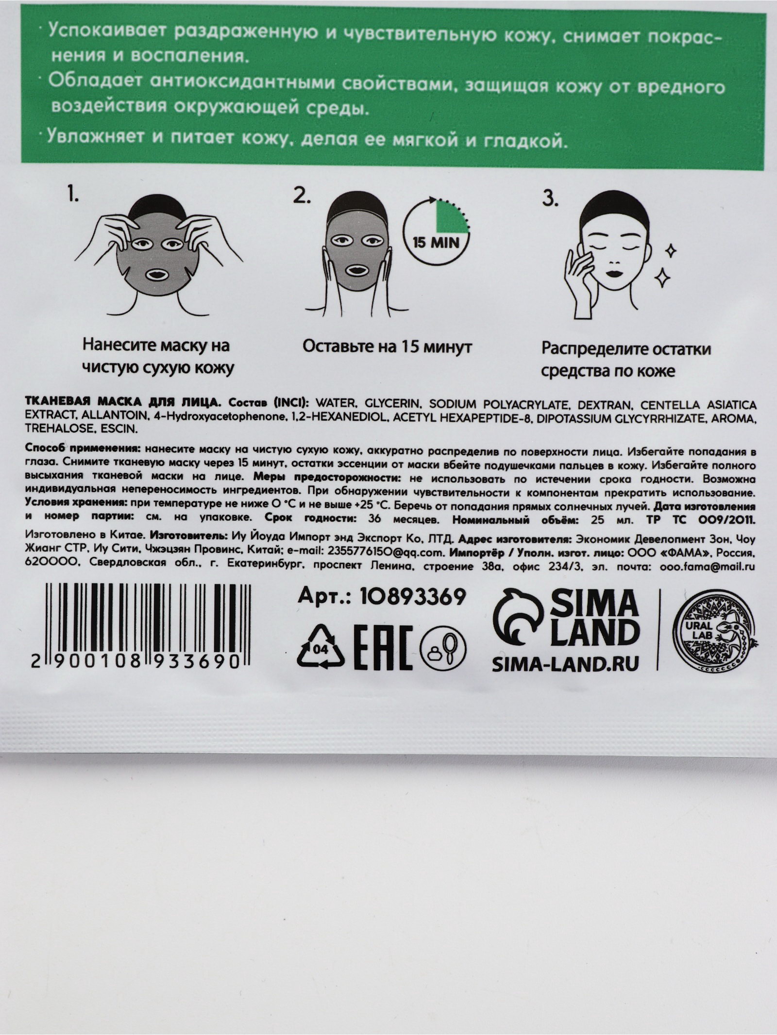 Маска для лица тканевая с экстрактом центеллы азиатской, успокаивающая, ULAB, URAL LAB, Китай