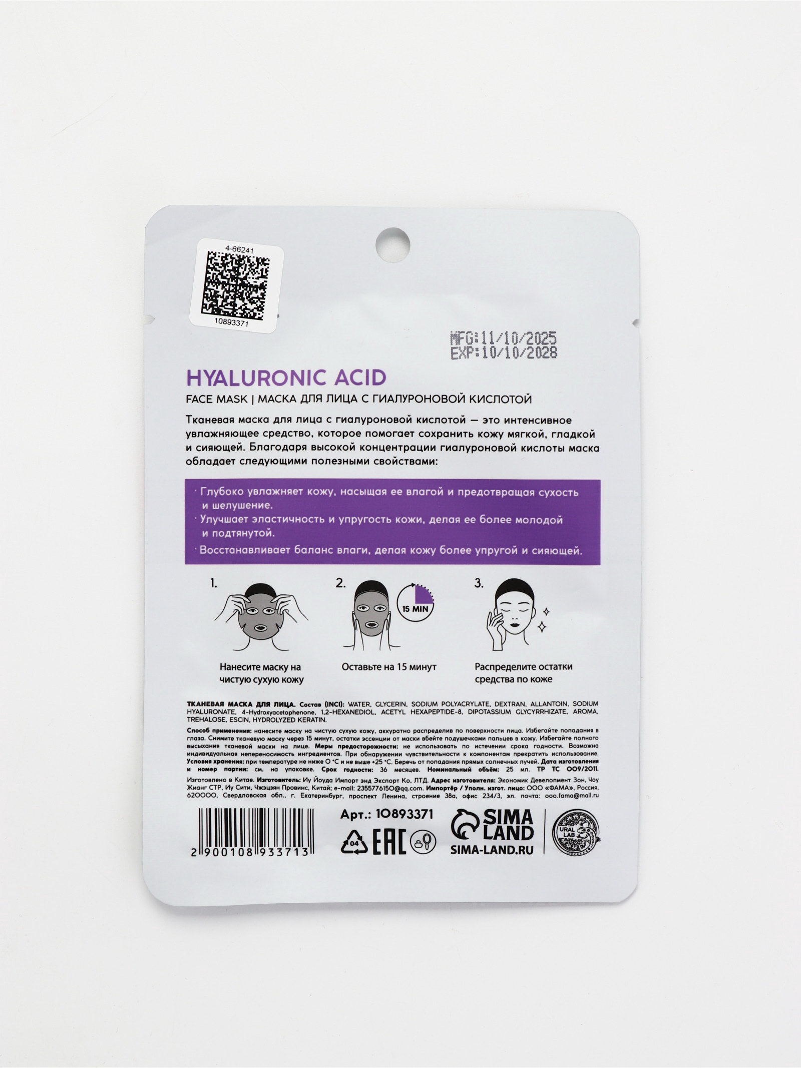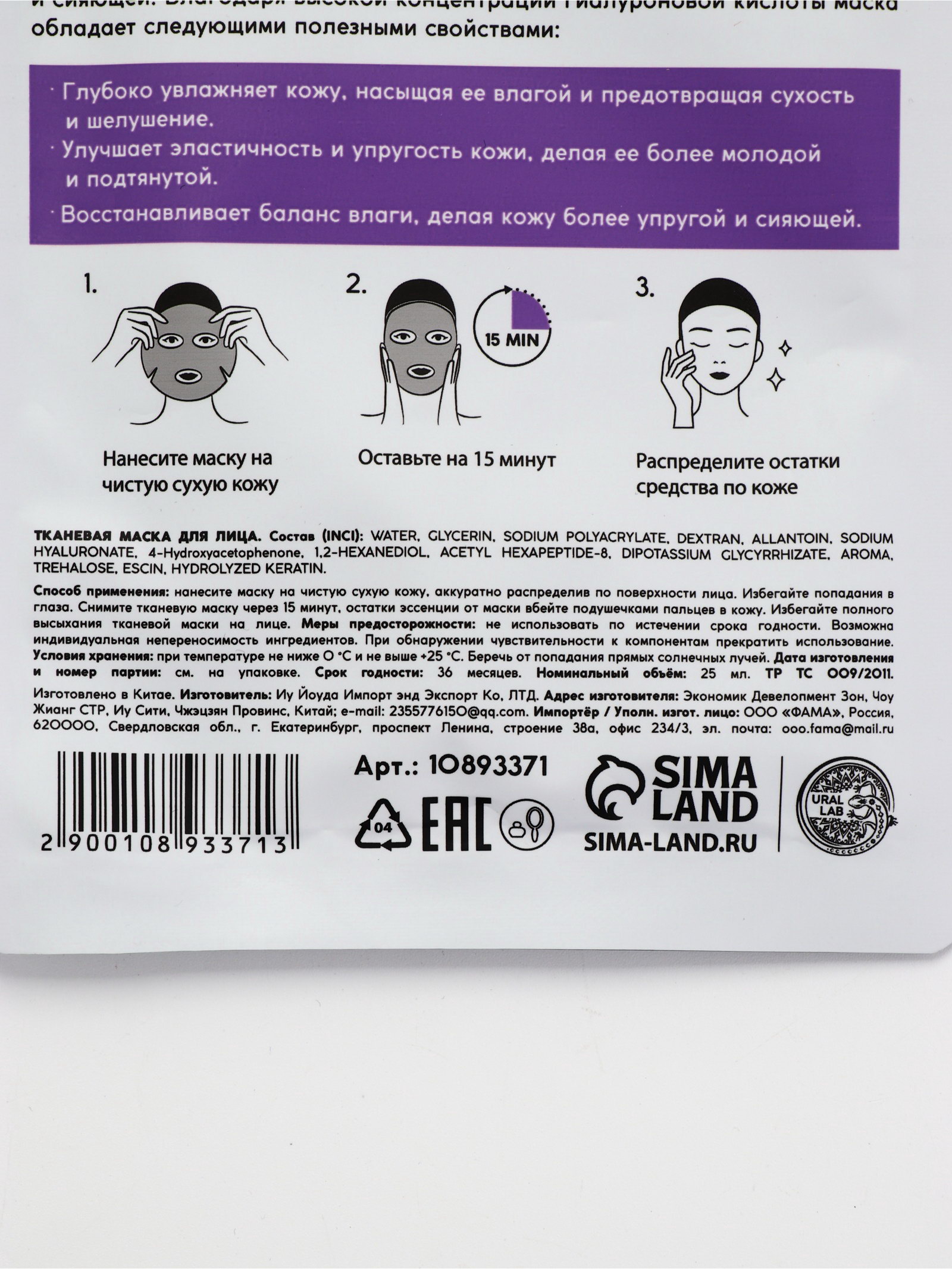 Маска для лица тканевая с гиалуроновой кислотой, увлажняющая, ULAB, URAL LAB, Китай
