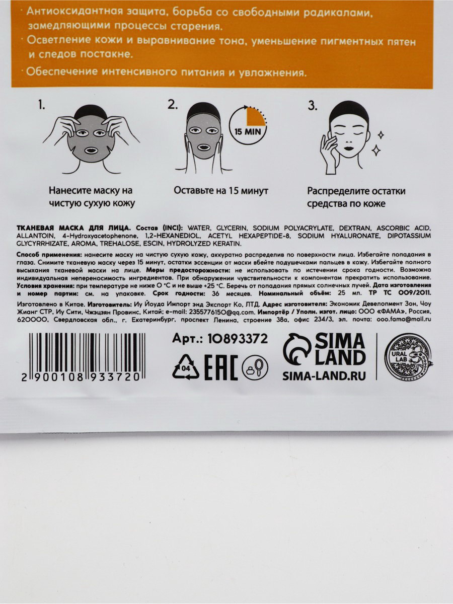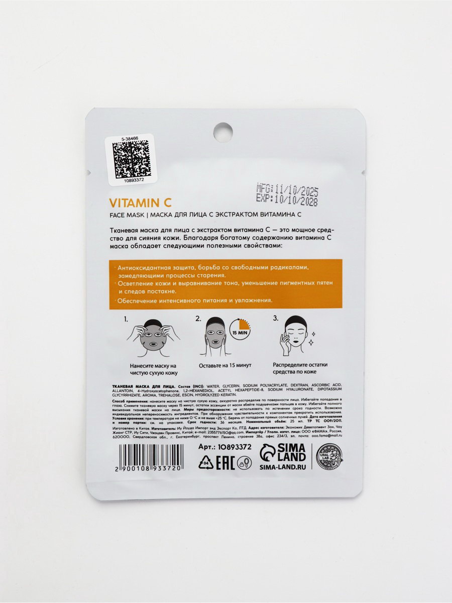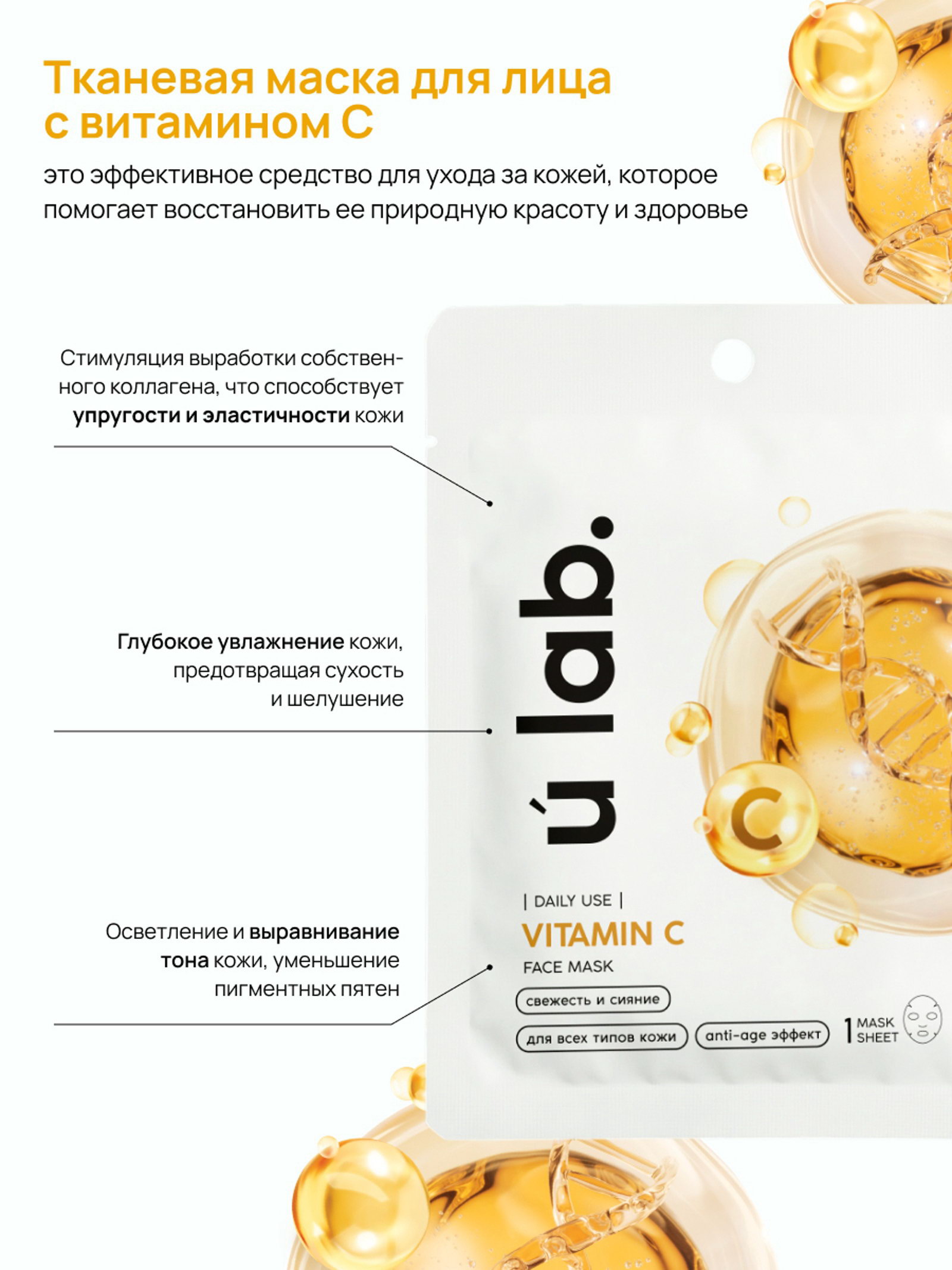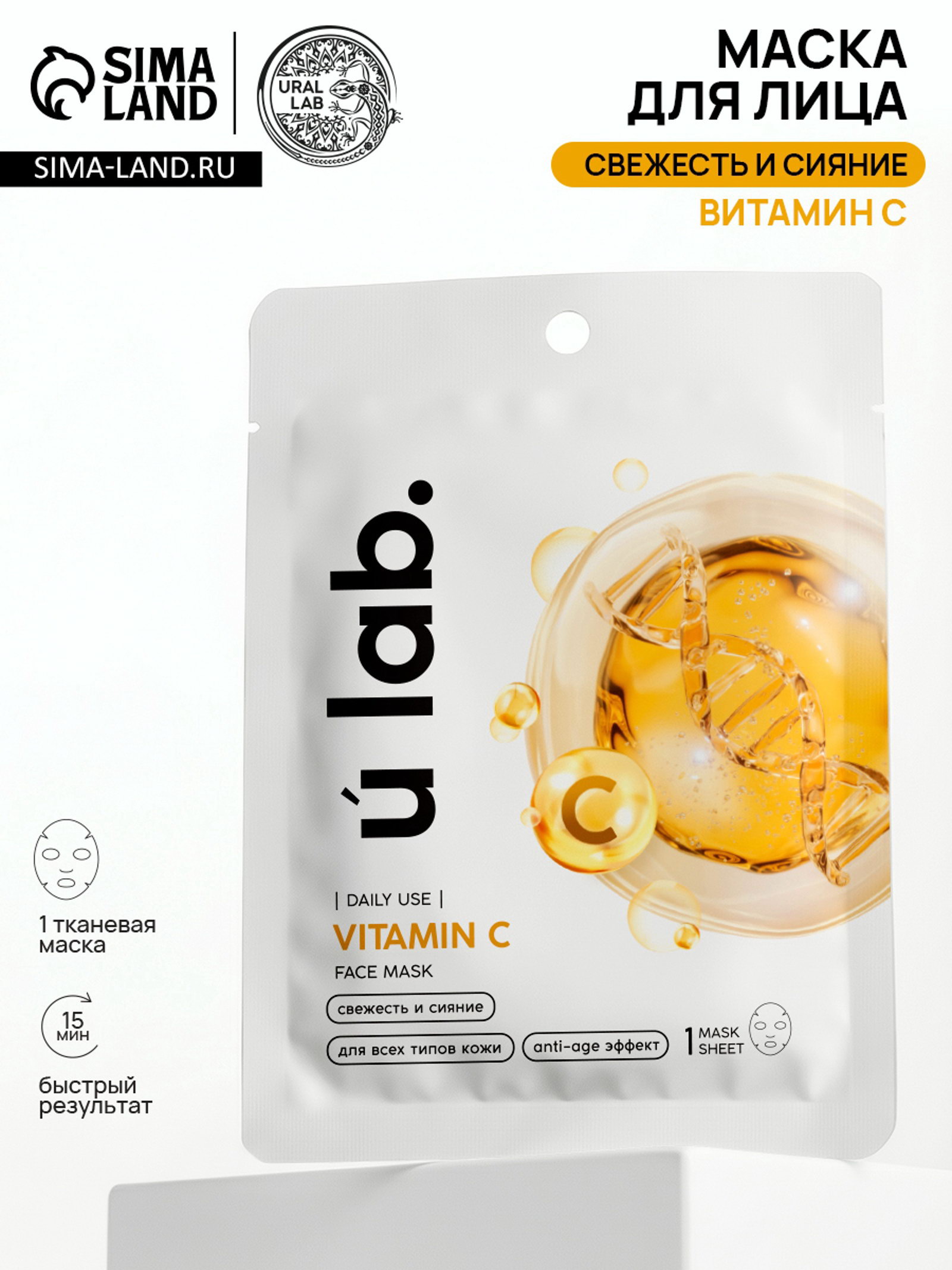 Маска для лица тканевая с экстрактом витамина С, anti-age эффект, ULAB, URAL LAB, Китай