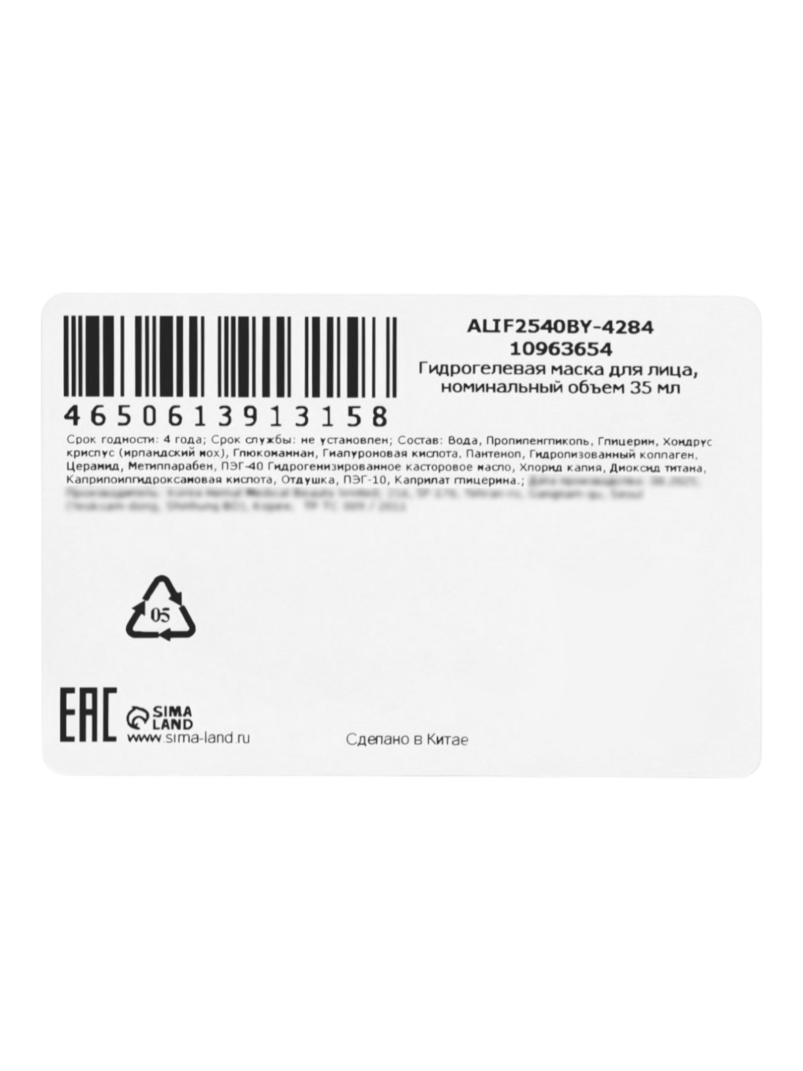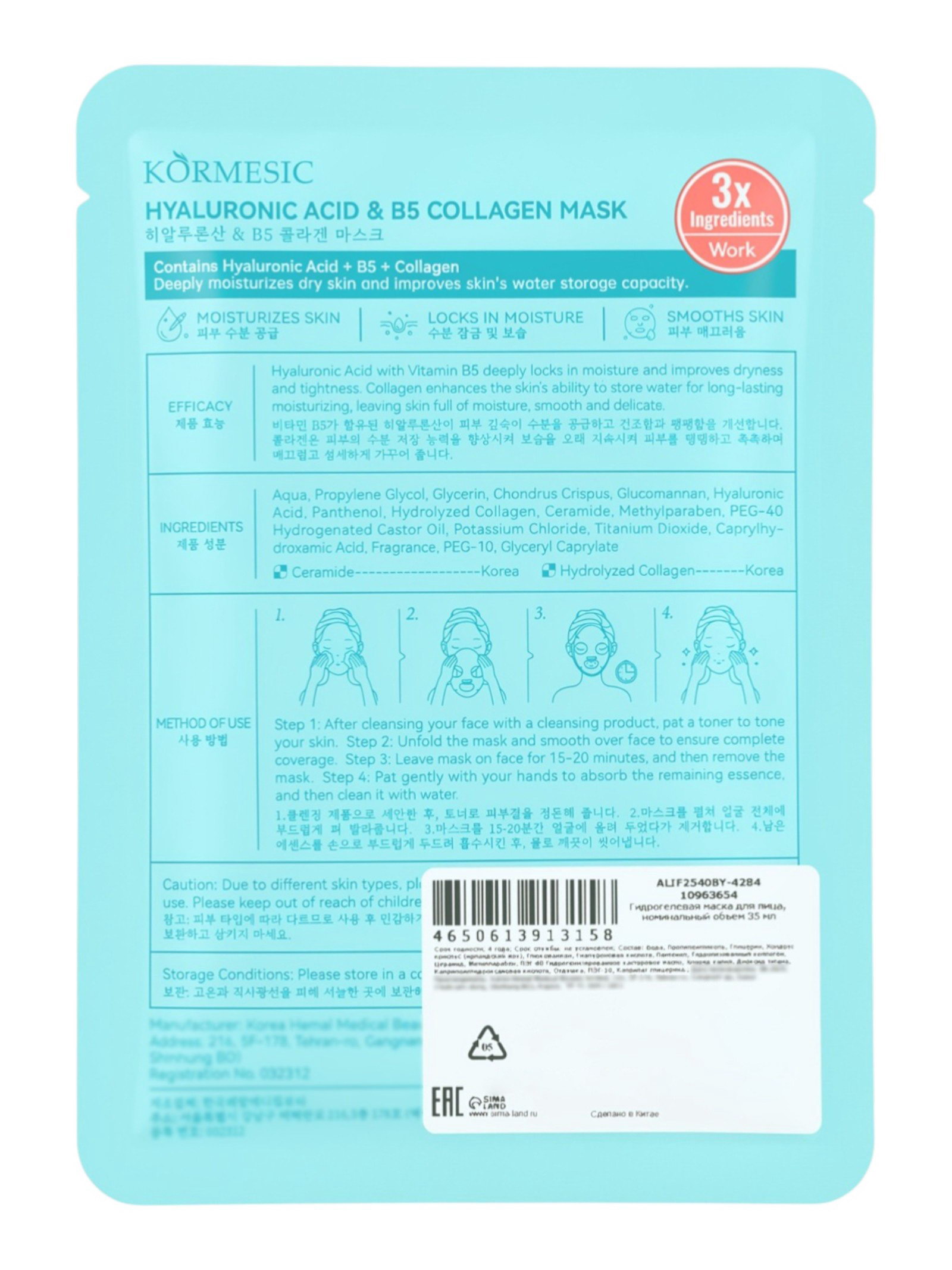 Гидрогелевая маска с гиалуроновой кислотой, 35 мл, Kormesic, Китай