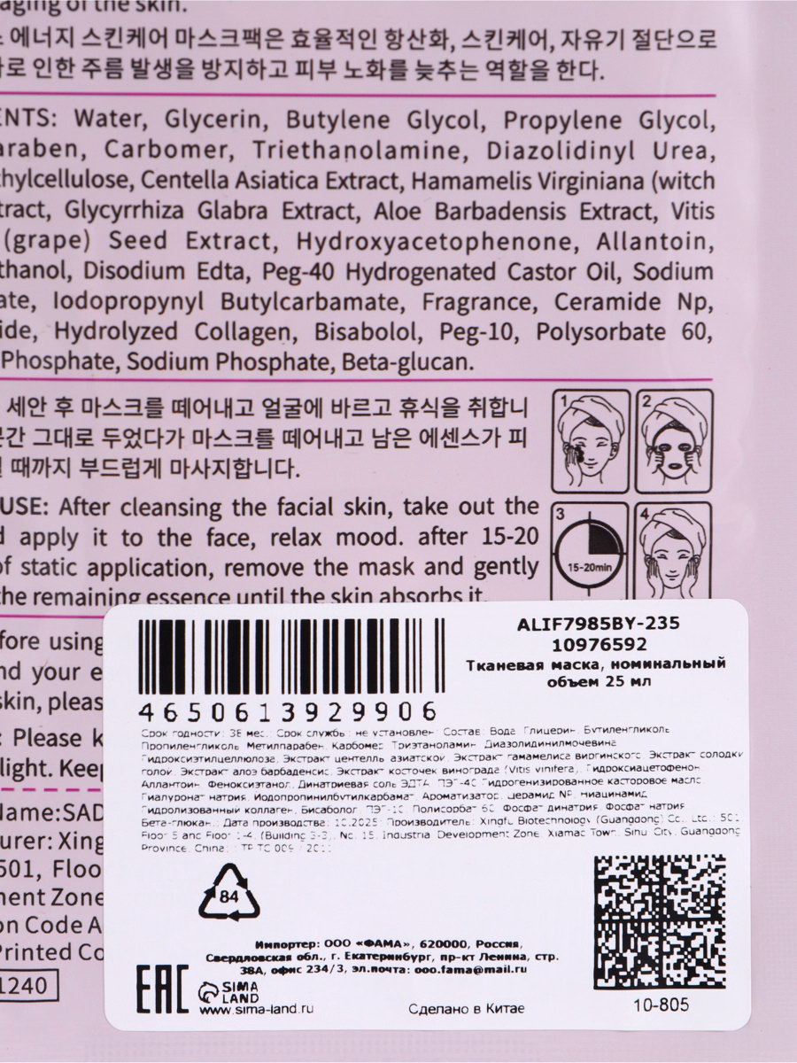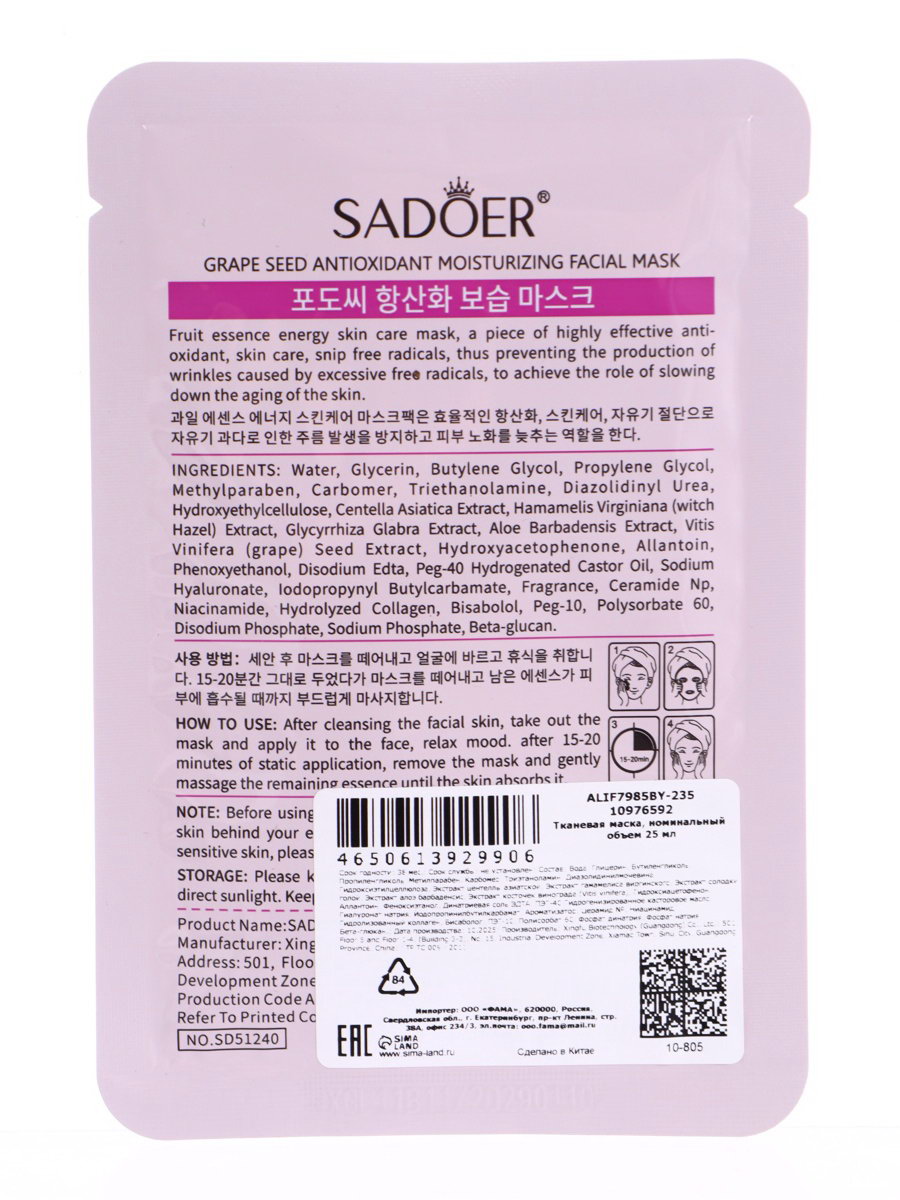 Успокаивающая маска для лица "Виноград" 25 мл, SADOER, Китай
