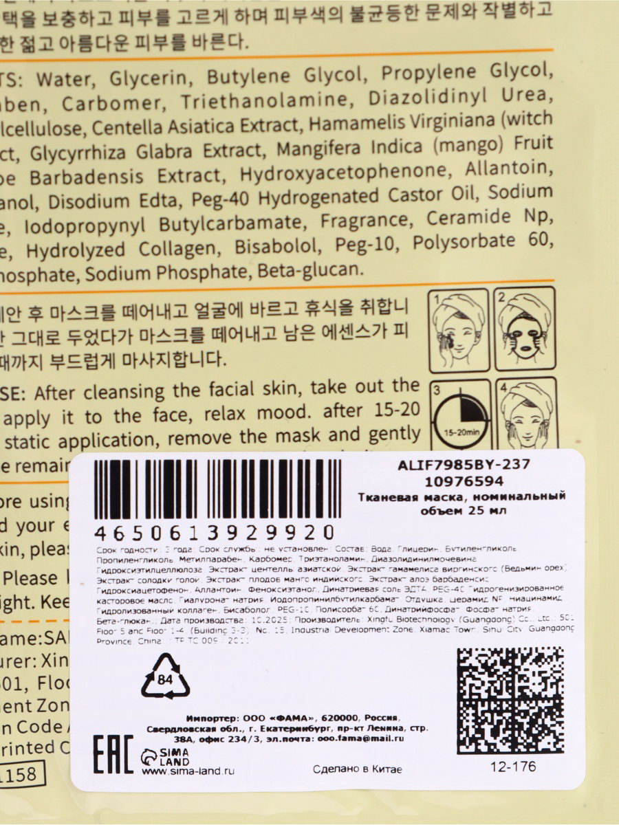 Маска для лица успокаивающая "Манго", 25 мл, SADOER, Китай