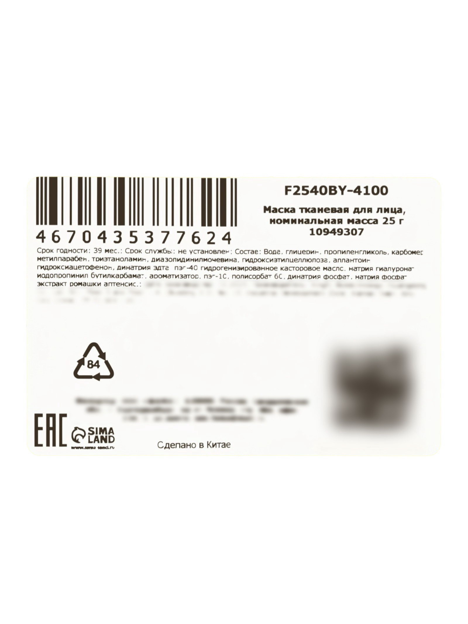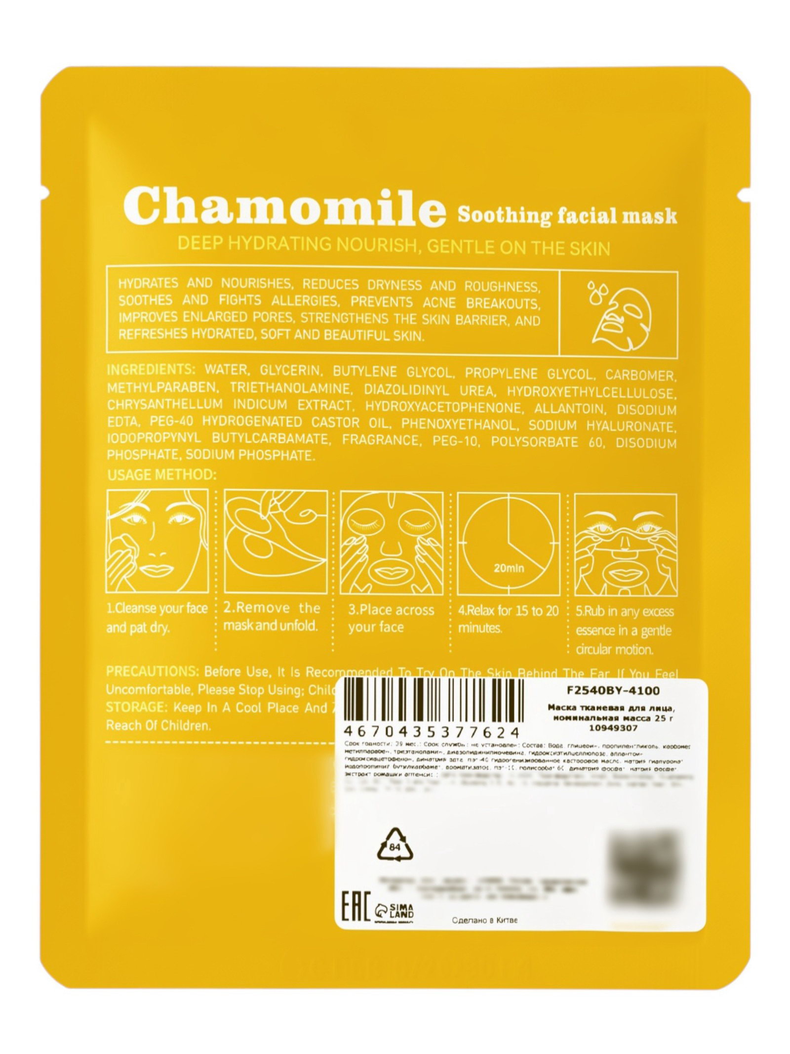 Маска тканевая увлажняющая для лица "Ромашка", 25 г, SADOER, Китай