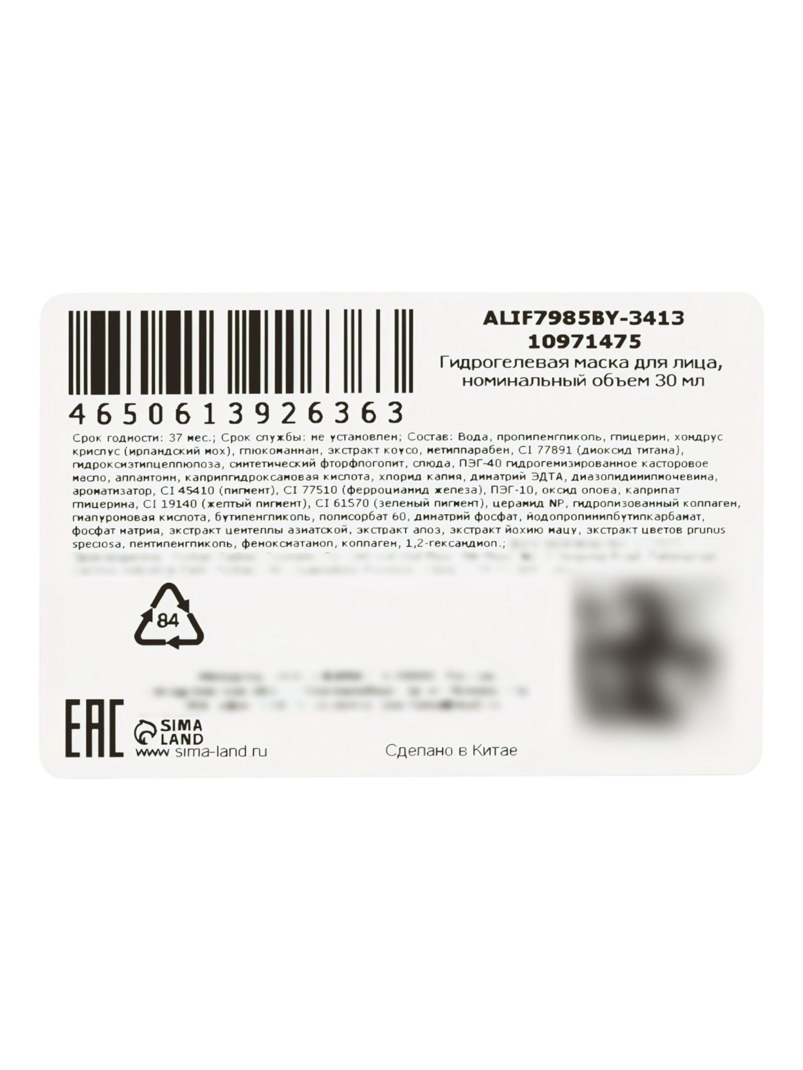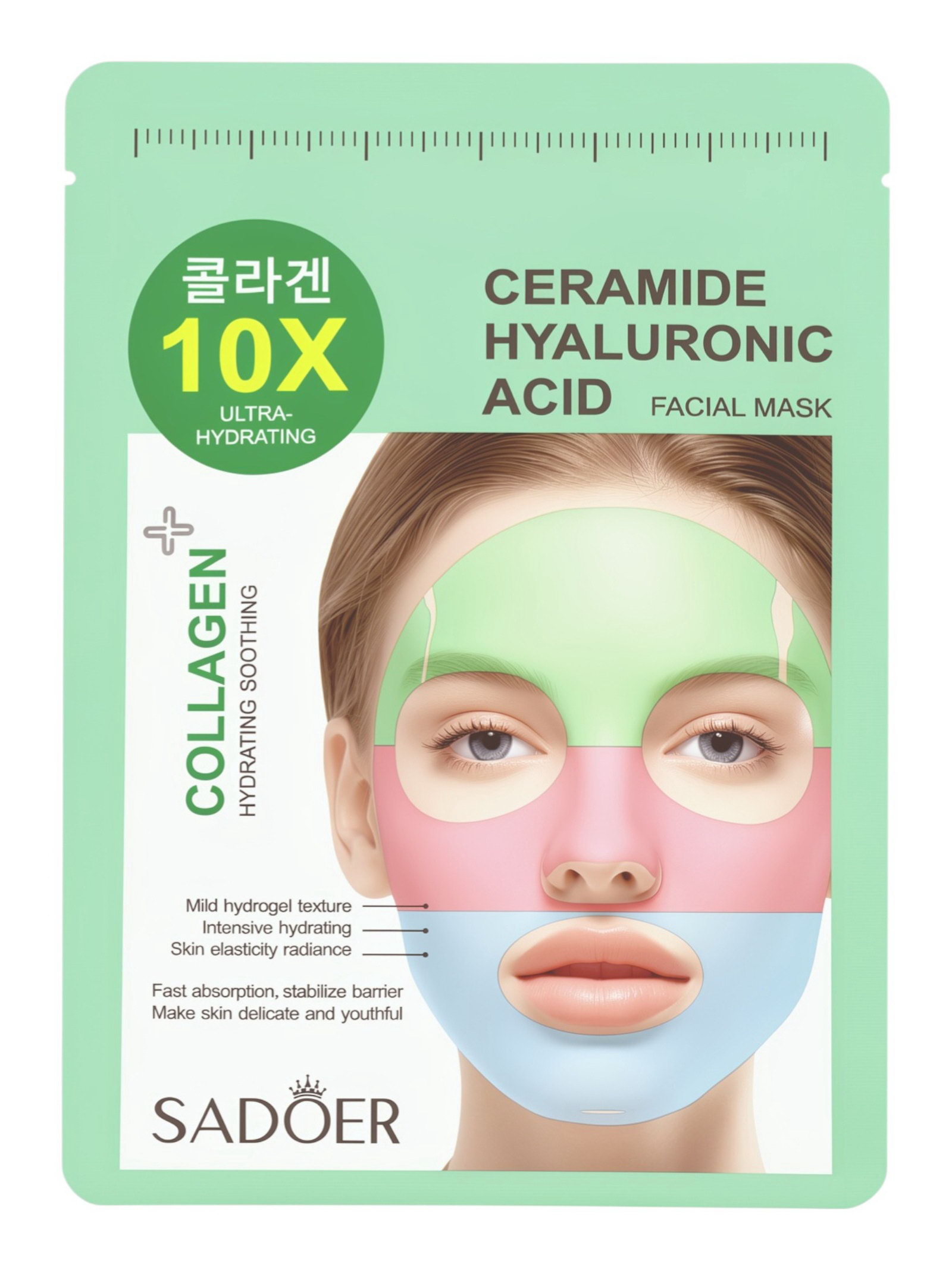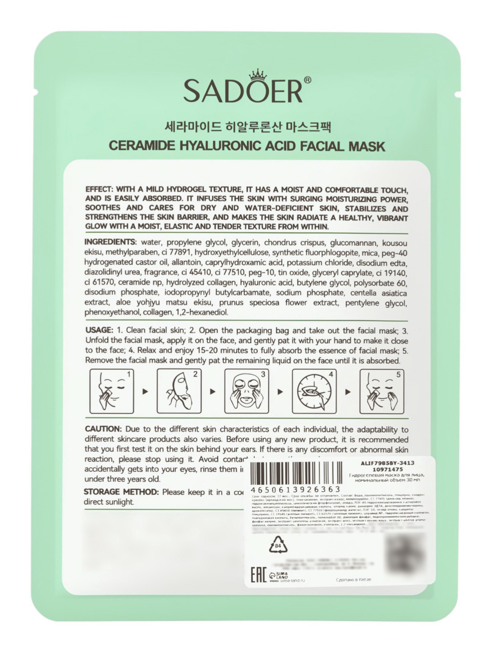 Гидрогелевая маска для лица, с церамидом и гиалуроновой кислотой, 30 мл, SADOER, Китай