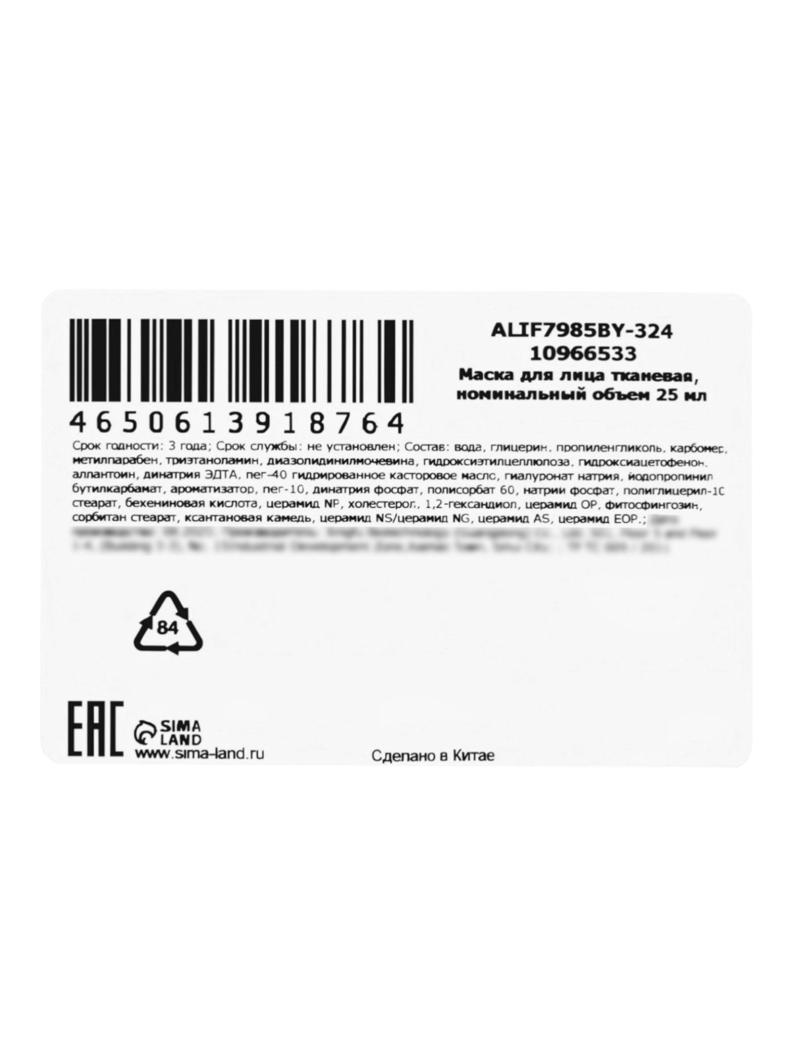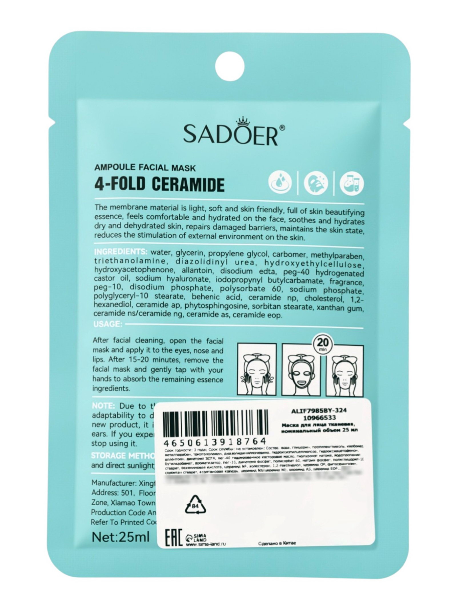 Маска с церамидом, 25 мл, SADOER, Китай
