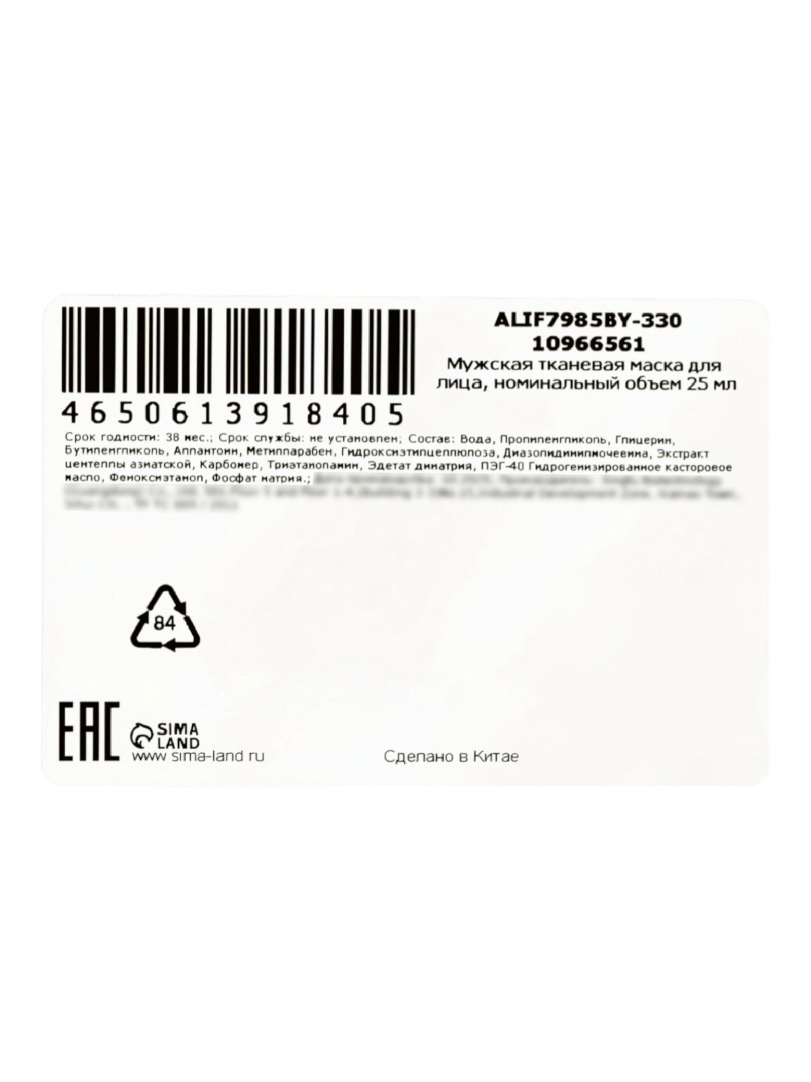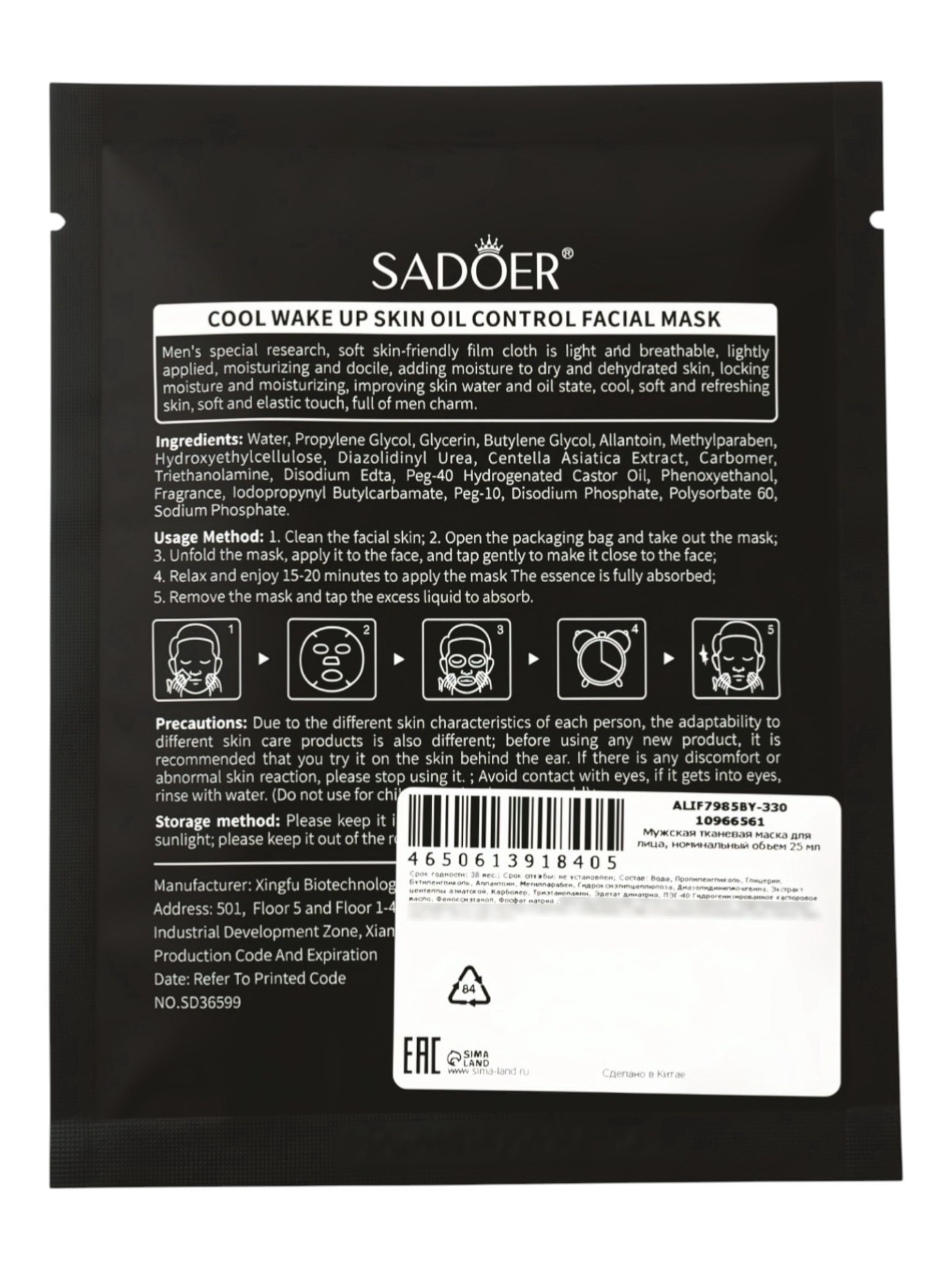 Мужская тканевая маска, увлажняющая, 25 мл, SADOER, Китай