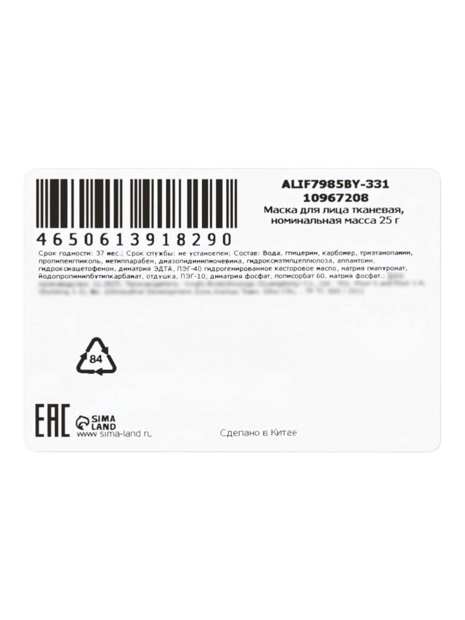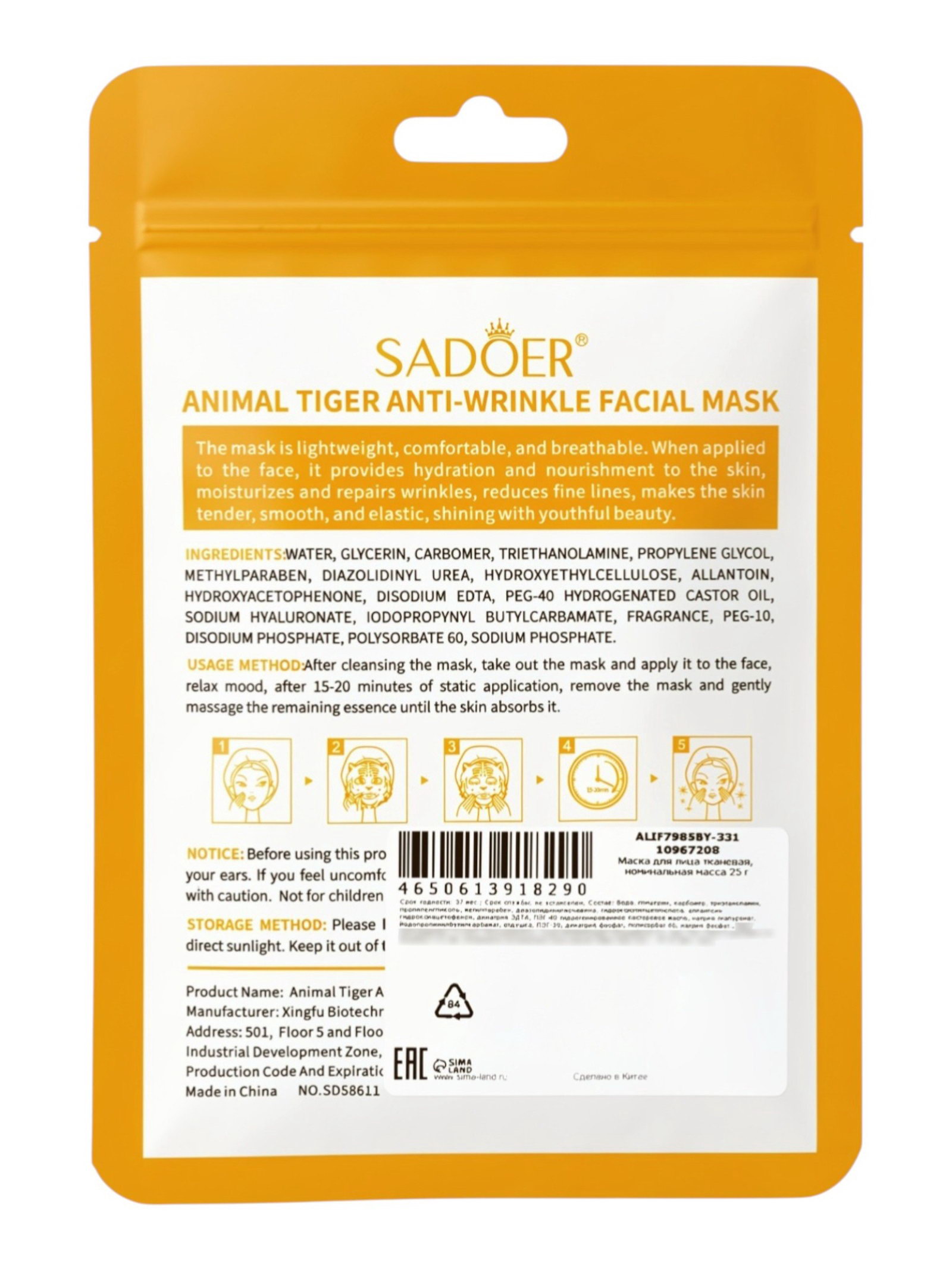 Тканевая маска, увлажняющая "Тигрёнок", 25 мл, SADOER, Китай