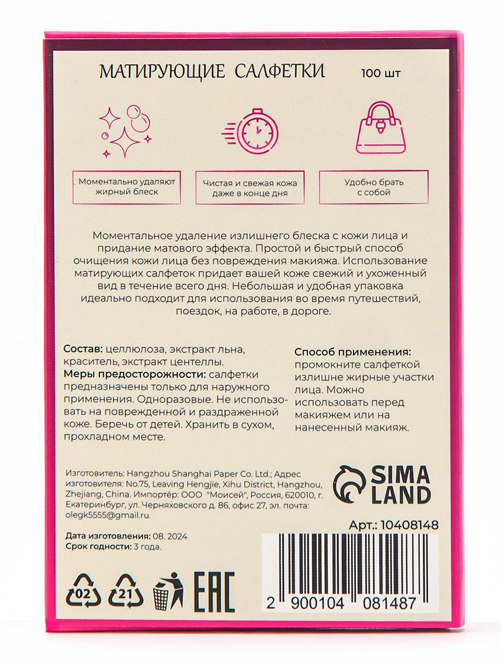 Размер упаковки: 7 x 0.5 x 10 см. В упаковке, шт.: 100 Особенности: С экстрактом tnved: 4818201000 Матирующие салфетки уберут жирный блеск, обеспечат лицу свежесть и ухоженный вид, не повредив при этом макияж. Используйте по 1–2 салфетки в день и будете отменно выглядеть как утром, так и вечером. Применять салфетки очень просто: мягко прикладывайте листок к жирным участкам лица, удаляя кожное сало. Одной салфетки хватит на все проблемные зоны. Благодаря экономичному расходу можно длительное время пользоваться одной упаковкой. Немаловажно, что компактный размер конверта позволит носить салфетки с собой и поправлять макияж при первой необходимости. Чтобы матирующие салфетки радовали вас своей эффективностью, не забывайте о правилах безопасности: • не трите лицо и не стирайте салфетками макияж они для этого не предназначены; • после использования выкидывайте листок, не храните, так как повторное применение может привести к кожным заболеваниям; • не матируйте кожу больше 4 раз в день это может её высушить; • не применяйте салфетки, если появились высыпания на лице или возникла индивидуальная аллергическая реакция. | ||