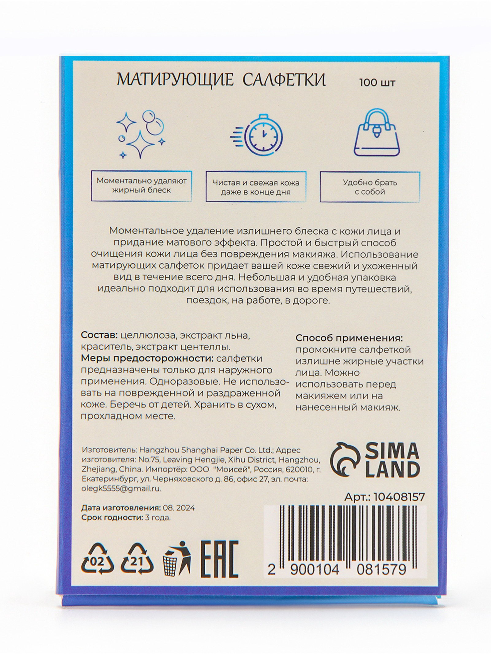 Матирующие салфетки Secret Beauty, 100 шт., синие, SB BEAUTY, Китай