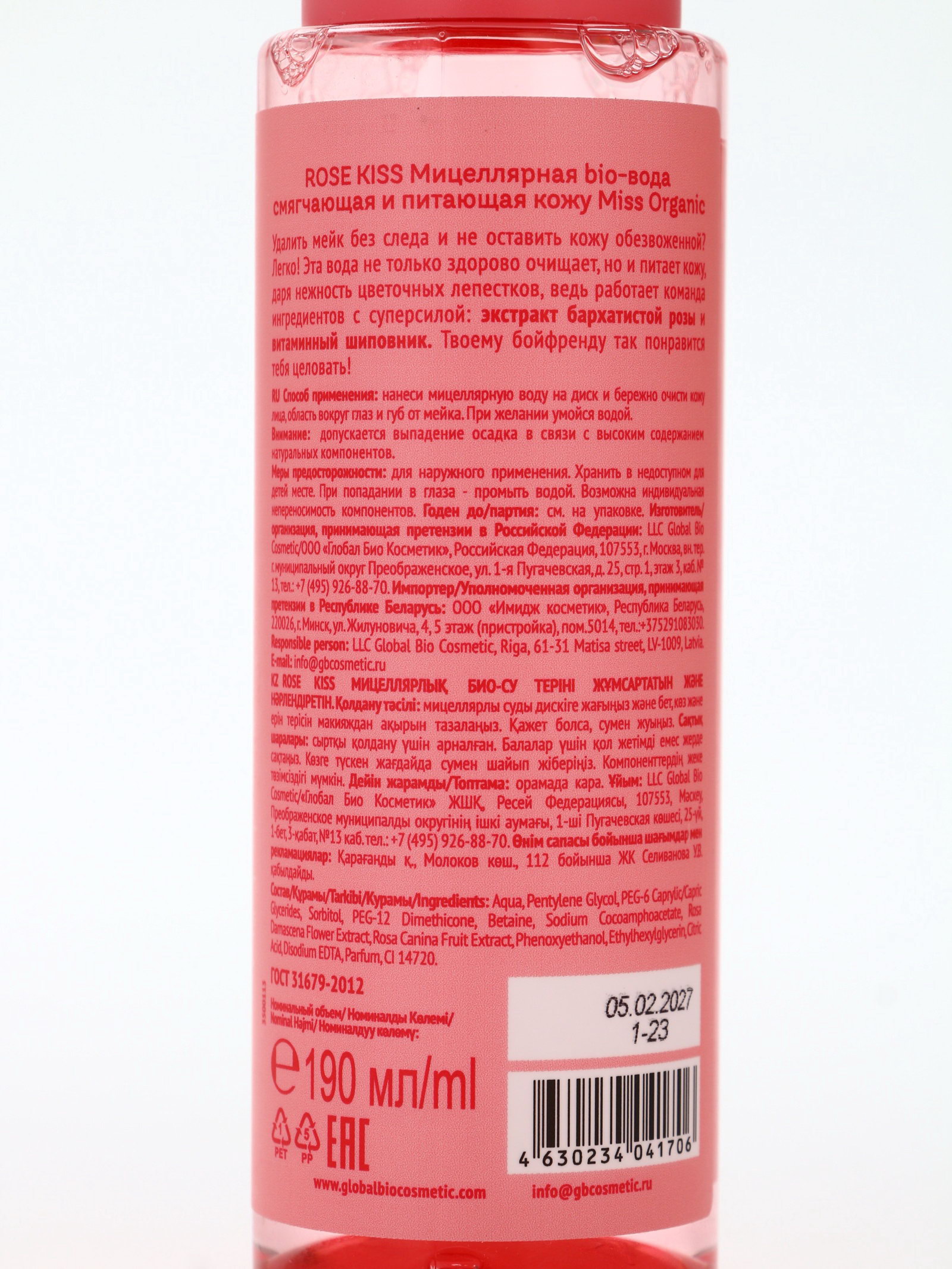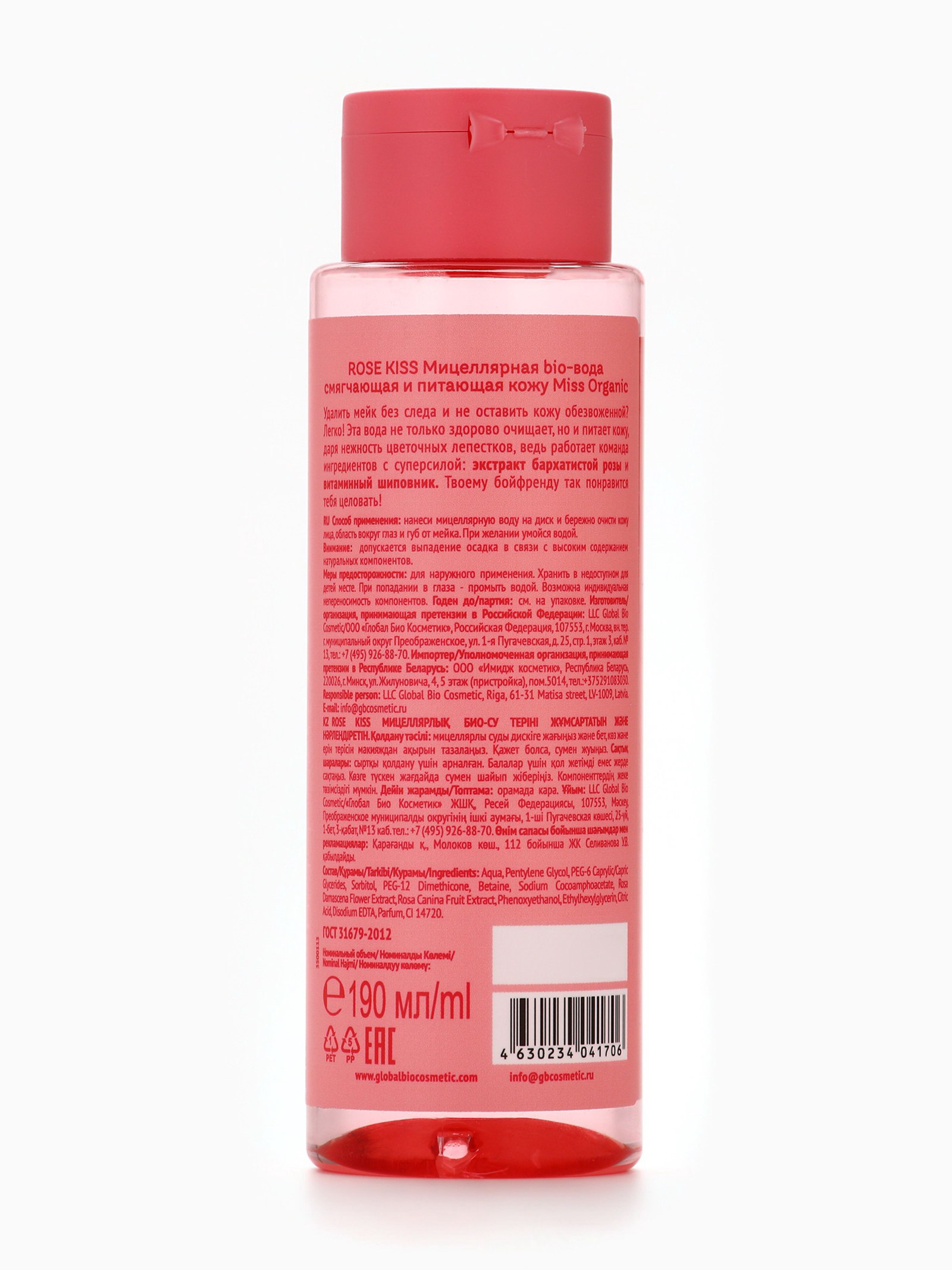 Мицеллярная вода Rose kiss, смягчающая и питающая кожу, 190 мл, Miss Organic, Россия
