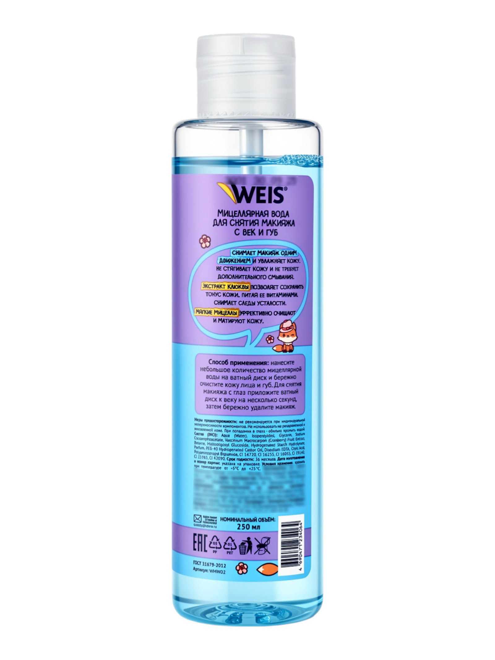 Мицеллярная вода для снятия макияжа с век и губ, 250 мл, Weis, Россия
