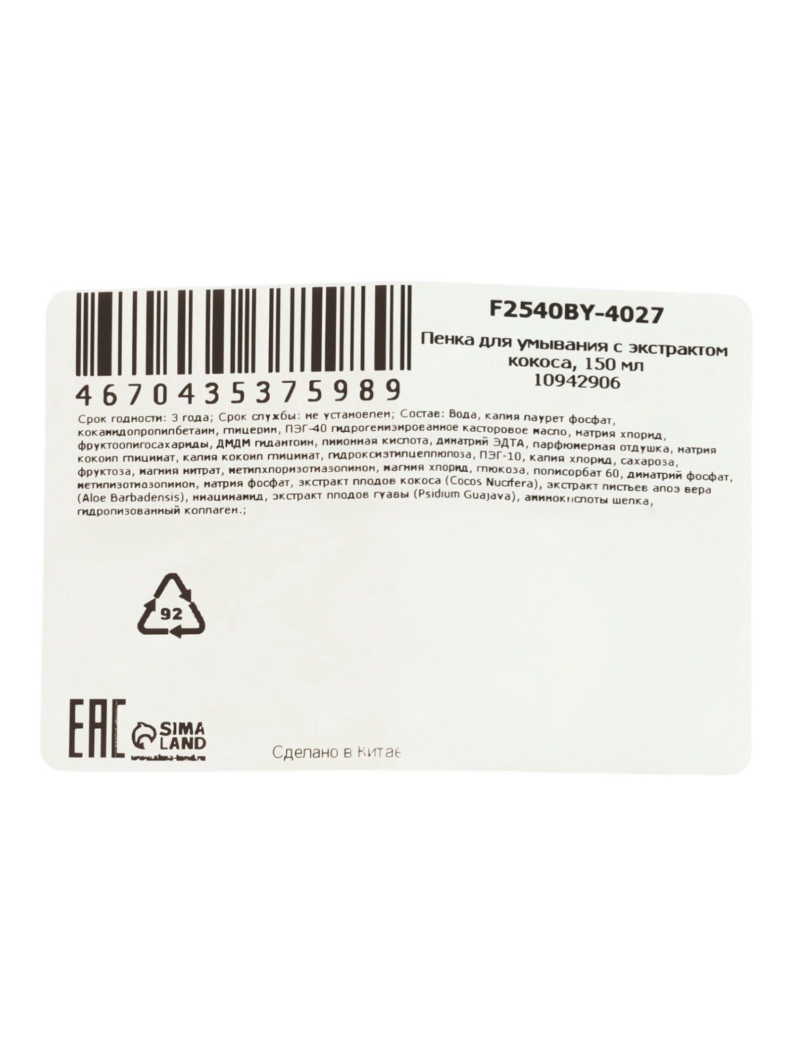 Пенка для умывания с экстрактом кокоса, 150 мл, Китай