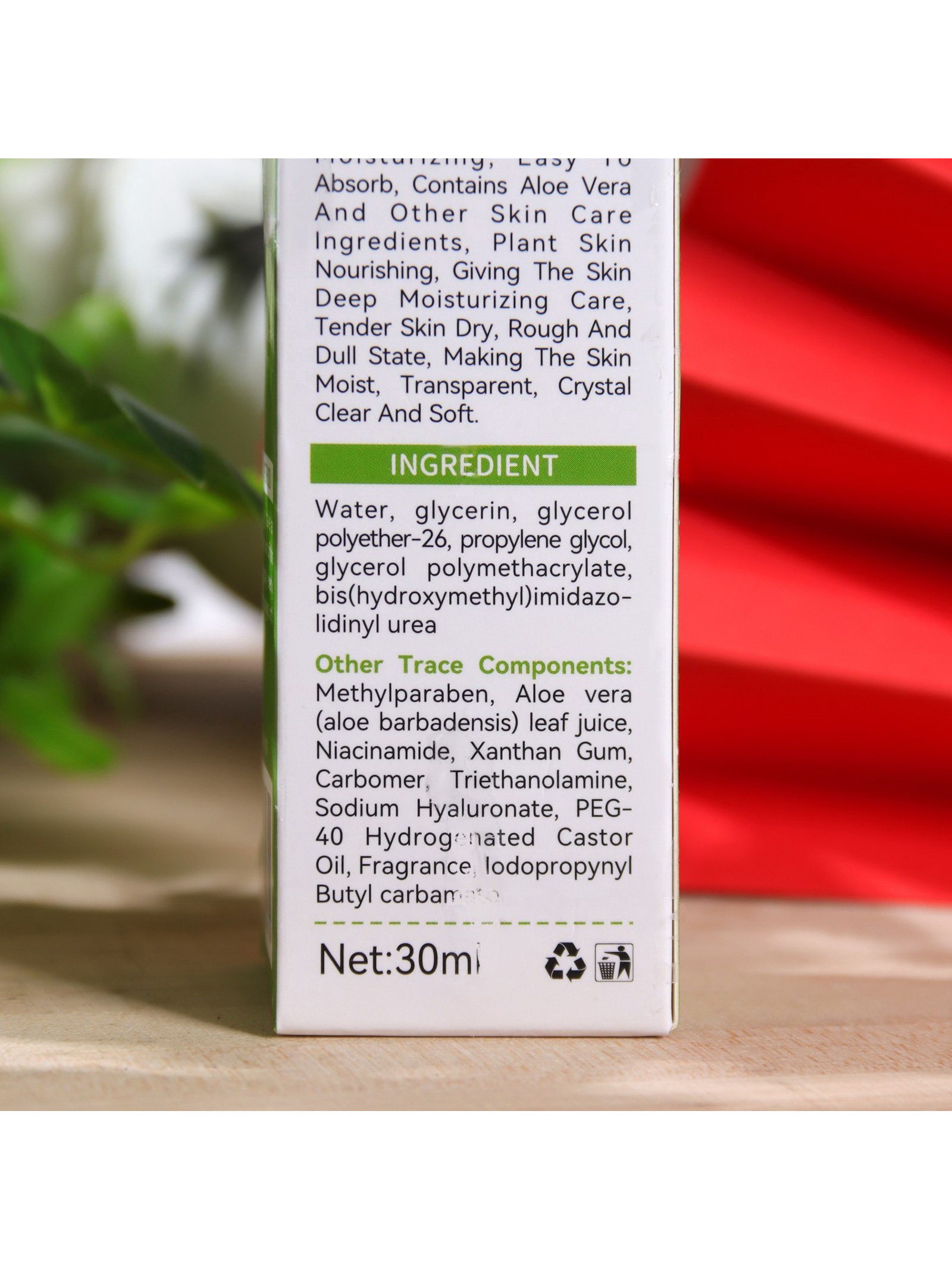 Размер упаковки: 3.5 x 10.5 x 3.5 см. tnved: 3304990000 Вес, г/Объём, мл: 30 Вид: Сыворотка Область применения: Для лица Тип кожи: Для всех типов Тип кожи: Для всех типов Сыворотка интенсивного увлажнения с алоэ вера глубоко увлажняет кожу лица, восстанавливает гидробаланс, способствуют восстановлению и усилению защитных свойств кожи. Уходовая косметика проводит профилактику преждевременного старения кожи, борьбу с морщинами, обеспечивая анти эйдж эффект, нормализует работу сальных желез и предупреждает появление акне. Популярный компонент в составе эссенции в виде гиалуроновой кислоты обладает восстанавливающим эффектом, способствует разглаживанию мимических морщин, растяжек и кожных заломов, участвует в регенерации ткани, омолаживает и повышает защитные свойства кожи. Сыворотка эссенция для лица прекрасно подойдет в качестве базы под макияж. Возможно использование увлажняющей сыворотки для лица в наборе с другой уходовой косметикой и косметикой для лица. Также гиалуроновую алоэ-сыворотку для лица возможно использовать под мезороллер и в качестве восстанавливающей сыворотки для лица после химического пилинга. Состав: Water, glycerin, glycerol polyether-26, propylene glycol, glyceryl polymethacrylate, bis(hydroxymethyl)imidazolidinyl urea Other Trace Components: Methylparaben, Aloe vera (aloe barbadensis) leaf juice, Niacinamide, Xanthan Gum, Carbomer, Triethanolamine, Sodium Hyaluronate, PEG- 40 Hydrogenated Castor Oil, Fragrance, iodopropynyl Butylcarbamate Как применять сыворотку: