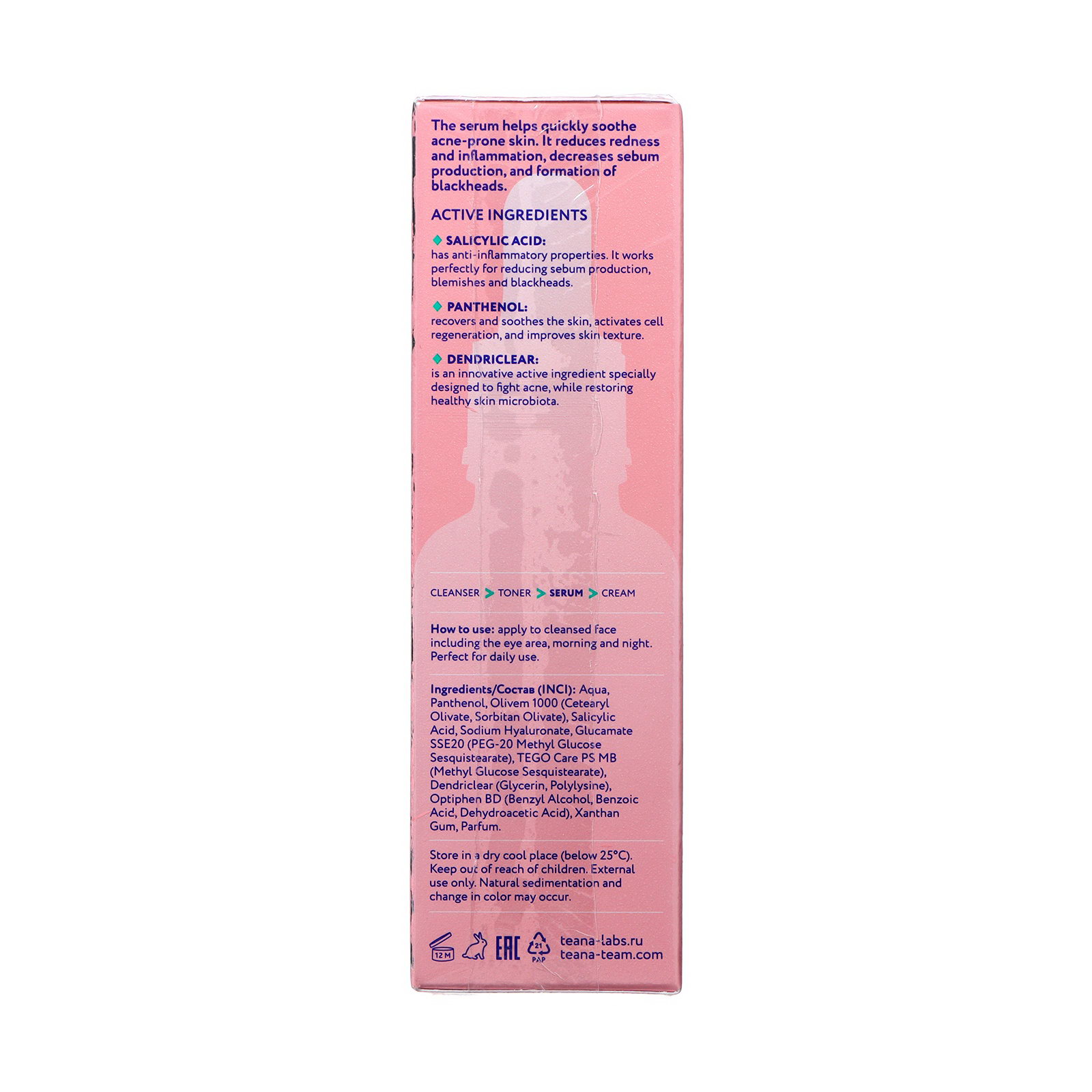 Легкая текстура сыворотки делает нанесение комфортным и быстрым. Буквально 2-3 капель достаточно для нанесения на все лицо. Сыворотка быстро впитывается, делая кожу гладкой и нежной, готовой к нанесению дальнейшего ухода. Стеклянные затемненные флаконы с дозатором-пипеткой защищают содержимое от света, удобны в использовании и могут быть сданы на переработку после того, как сыворотка закончилась. Состав: Aqua, Panthenol, Olivem 1000 (Cetearyl Olivate, Sorbitan Olivate), Salicylic Acid, Sodium Hyaluronate, Glucamate SSE20 (PEG-20 Methyl Glucose Sesquistearate), TEGO Care PS MB (Methyl Glucose Sesquistearate), Dendriclear (Glycerin, Polylysine), Optiphen BD (Benzyl Alcohol, Benzoic Acid, Dehydroacetic Acid), Xanthan Gum, Parfum. Способ применения: Наносить на чистую сухую кожу лица, включая область вокруг глаз, утром и вечером, дождаться впитывания. Подходит для ежедневного ухода. Подходит для всех типов кожи. | ||