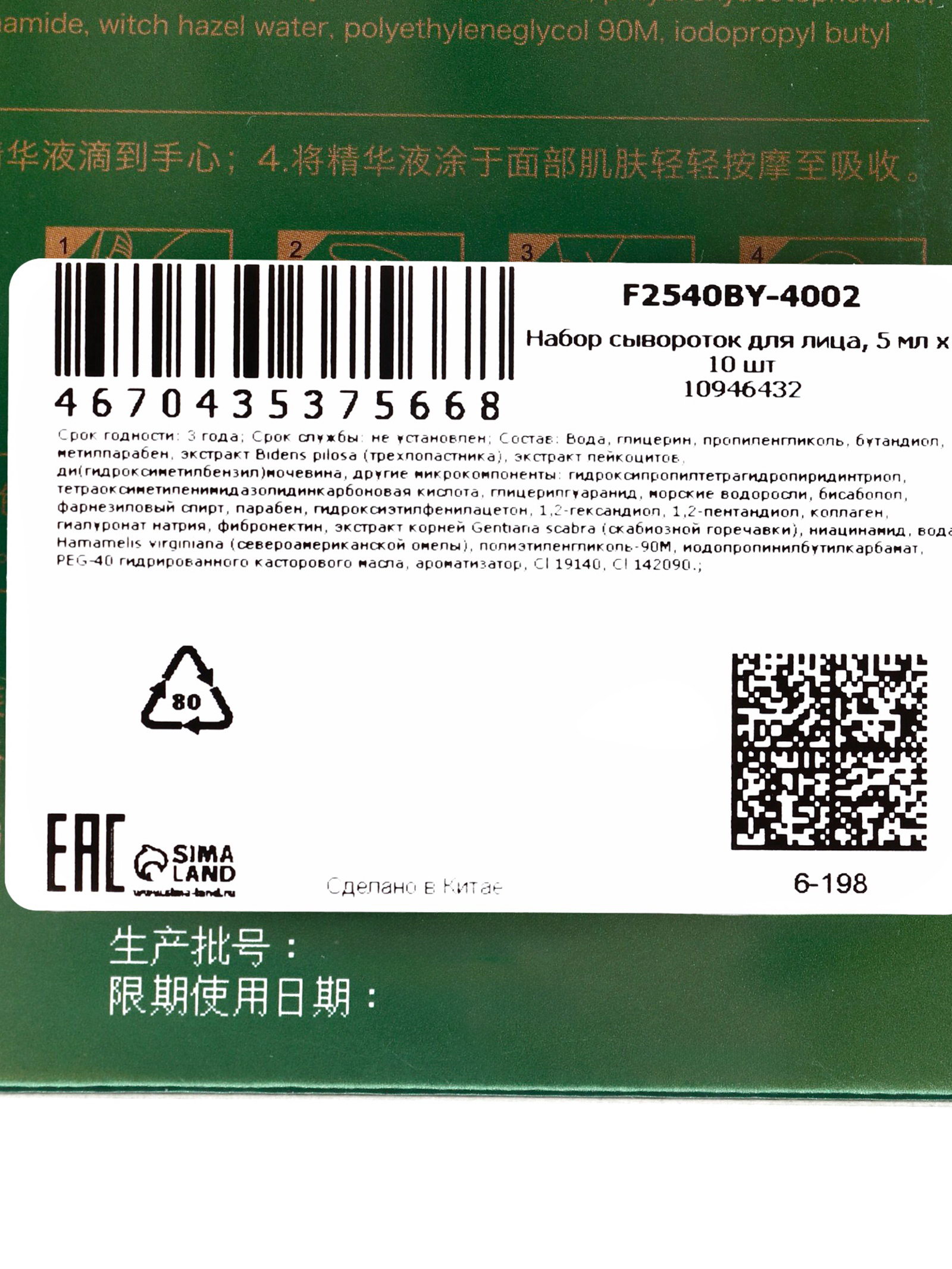 Тип кожи: Для всех типов, Зрелая Размер упаковки: 13.5 x 19.5 x 2.5 см. tnved: 3304990000 Область применения: Для лица Вид: Сыворотка Вес, г/Объём, мл: 5 Набор сывороток для лица в мини?формате (5?мл x?10?шт) создан для борьбы с морщинами и признаками возрастных изменений кожи. Средство сочетает в себе активные компоненты, направленные на увлажнение, укрепление кожи и стимулирование её естественных восстановительных процессов, с растительными экстрактами, в частности Bidens pilosa травой, известной своими успокаивающими, антиоксидантными и регенерирующими свойствами. Экстракт Bidens pilosa (трава, также известная как чёрный джек или травa с противовоспалительным действием) в косметике применяется для успокоения раздражённой кожи, поддержки её барьерной функции и защиты от оксидативного стресса, что помогает улучшить общее состояние кожи и повысить её устойчивость к внешним факторам. В сочетании с увлажняющими компонентами сыворотка выполняет комплексный уход в период возрастных изменений. Сыворотки удобно использовать курсом, а формат по 5?мл идеально подходит для пробного применения, путешествий или последовательного ухода. Основные эффекты