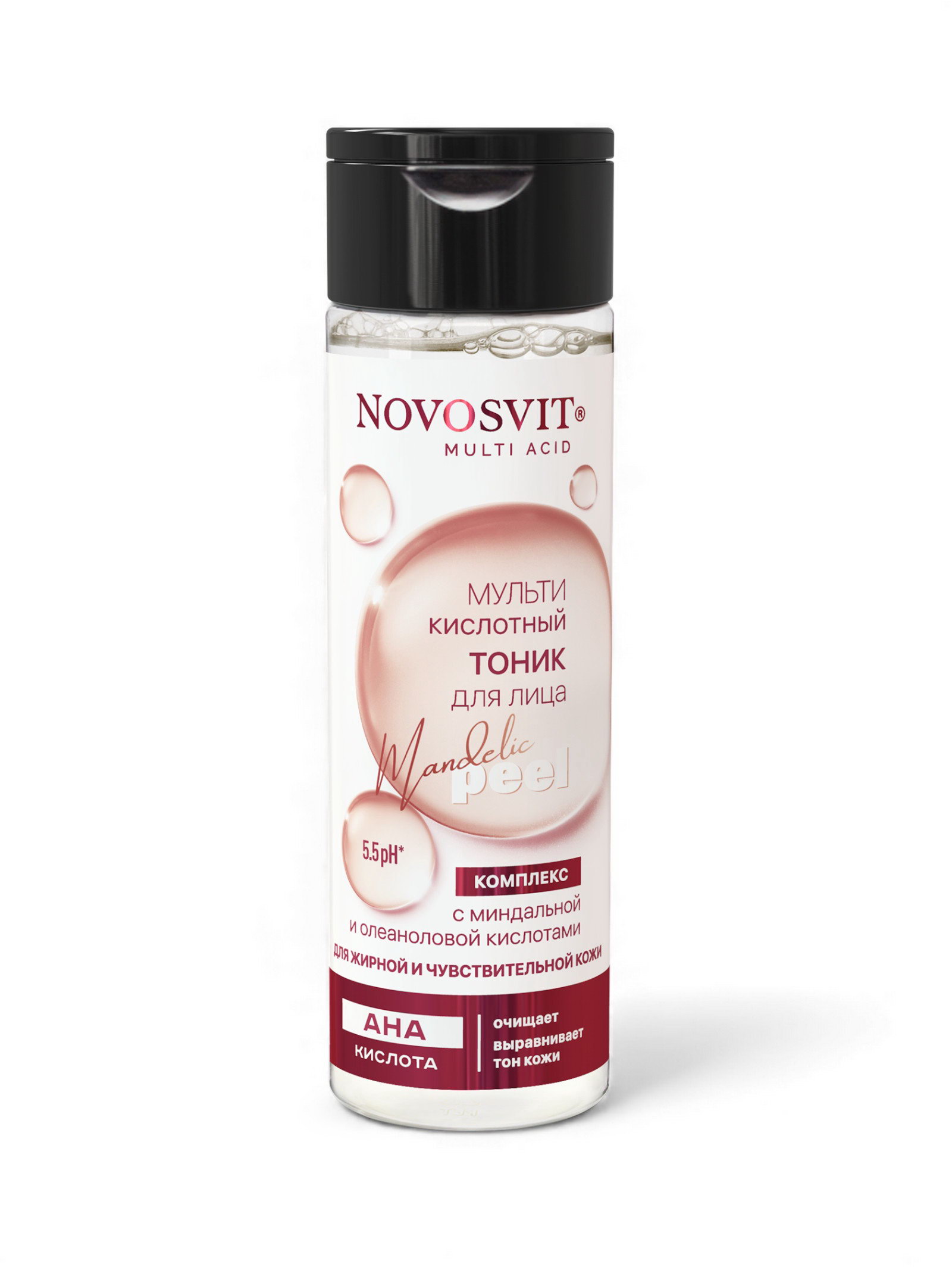 Тоник для лица мультикислотный с миндальной и олеаноловой кислотами, очищает и выравнивает тон кожи, 200 мл, NOVOSVIT, Россия