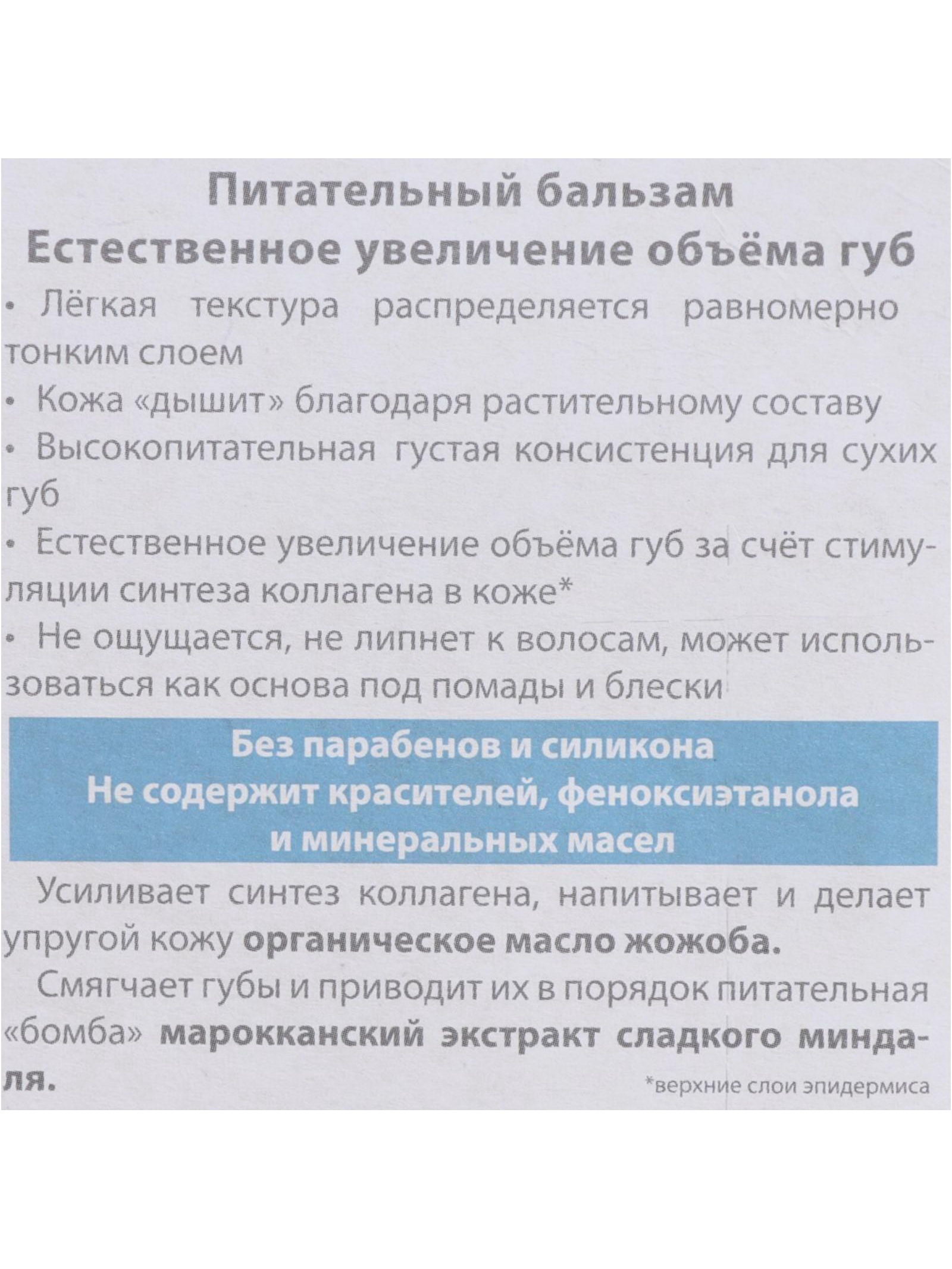 Вид: Гигиеническая помада, Помада-стик Размер упаковки: 7.5 x 2.5 x 12 см. tnved: 3304100000 Температурное ограничение: Нет Вес, г/Объём, мл: 4.2 Описание: питательный бальзам для губ Beuty Care - естественное увеличение объема губ. Легкая текстура распределяется равномерно тонким слоем. Кожа ""дышит"" благодаря растительному составу. Высокопитательная густая консистенция для сухих губ. Активные компоненты: касторовое масло, масло жожоба, экстракт сладкого миндаля, витамин E. Особенности: без парабенов и силикона. Не содержит красителей, феноксиэтанола и минеральных масел. Ограничения к применению: индивидуальная непереносимость компонентов. Состав: сera Alba, Cera Carnauba, Ricinus COmmunis Oil, Candelilla Cera, Prunus Amygdalus Dulcis Oil extract, Simmondsia Chinensis Seed Oil, Octymethoxycinnamate, Bisabolol, Tocopheryl Acetate, BHA, Parfum. | ||