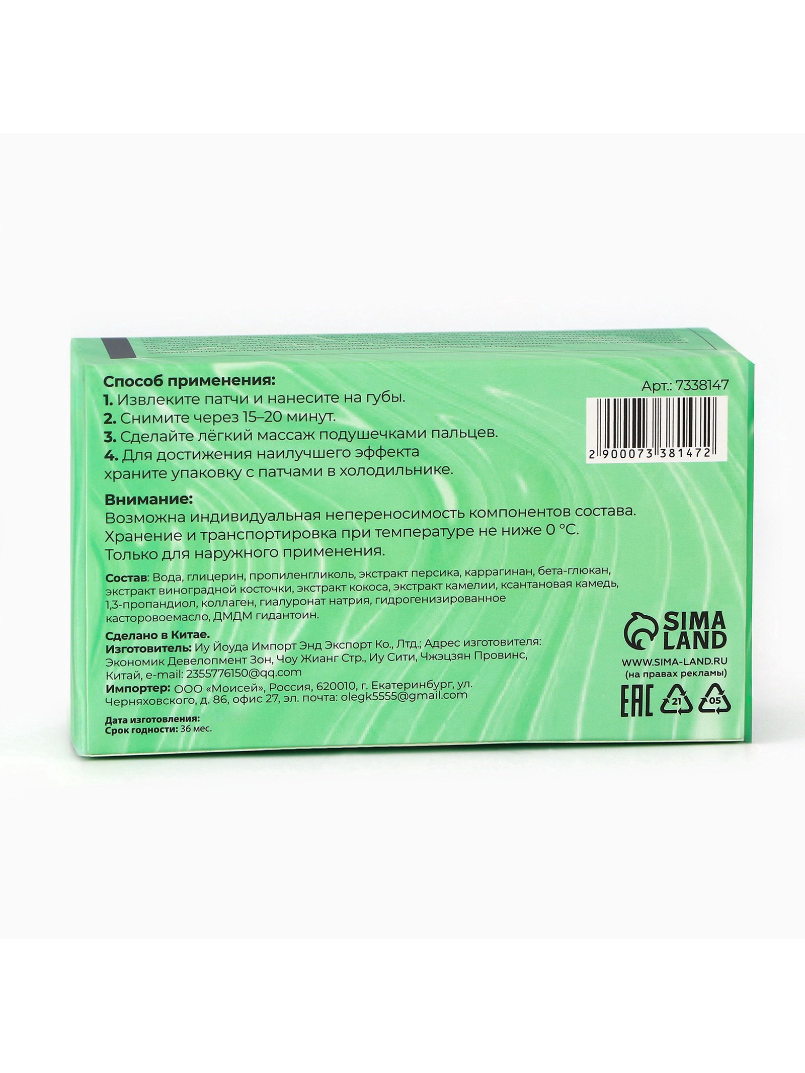 Патчи для губ с экстрактом алоэ вера, гидрогелевые, набор 20 шт., 15x10x2 см., SB BEAUTY, Китай
