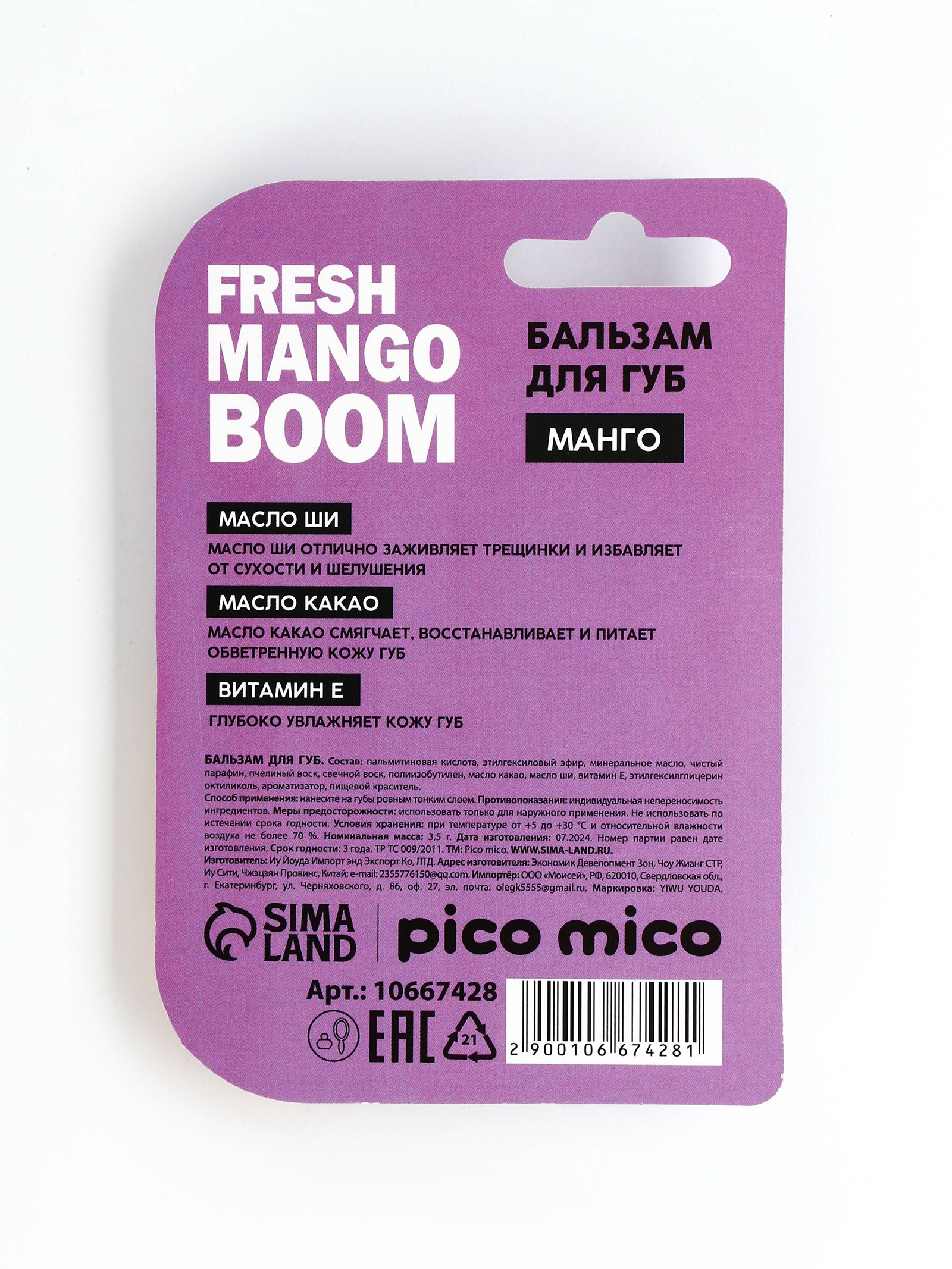 Бальзам для губ питание и увлажнение, с ароматом манго, 3.5 г, 2x8x13 см., PICO MICO, Китай