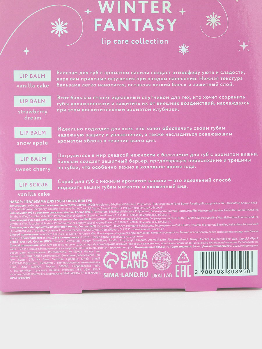 Подарочный набор новогодний Winter Fantasy, 4 бальзама и скраб для губ, 12.5x16.5x3.5 см., URAL LAB, Китай