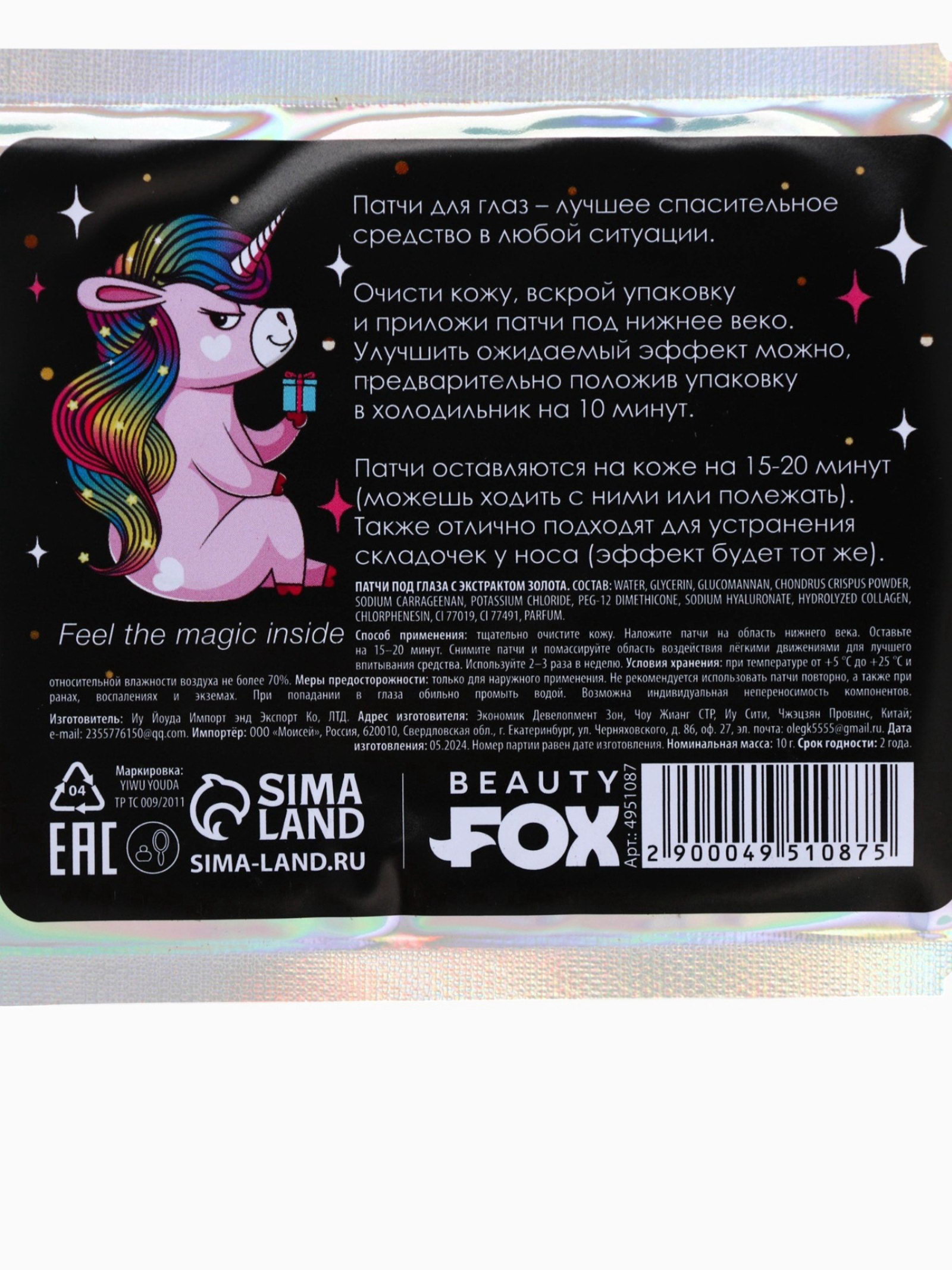 Патчи для глаз Sparkle wherever you GO, 1 пара, гидрогелевые с частицами золота, 9x13.5x0.5 см., Beauty Fox, Китай