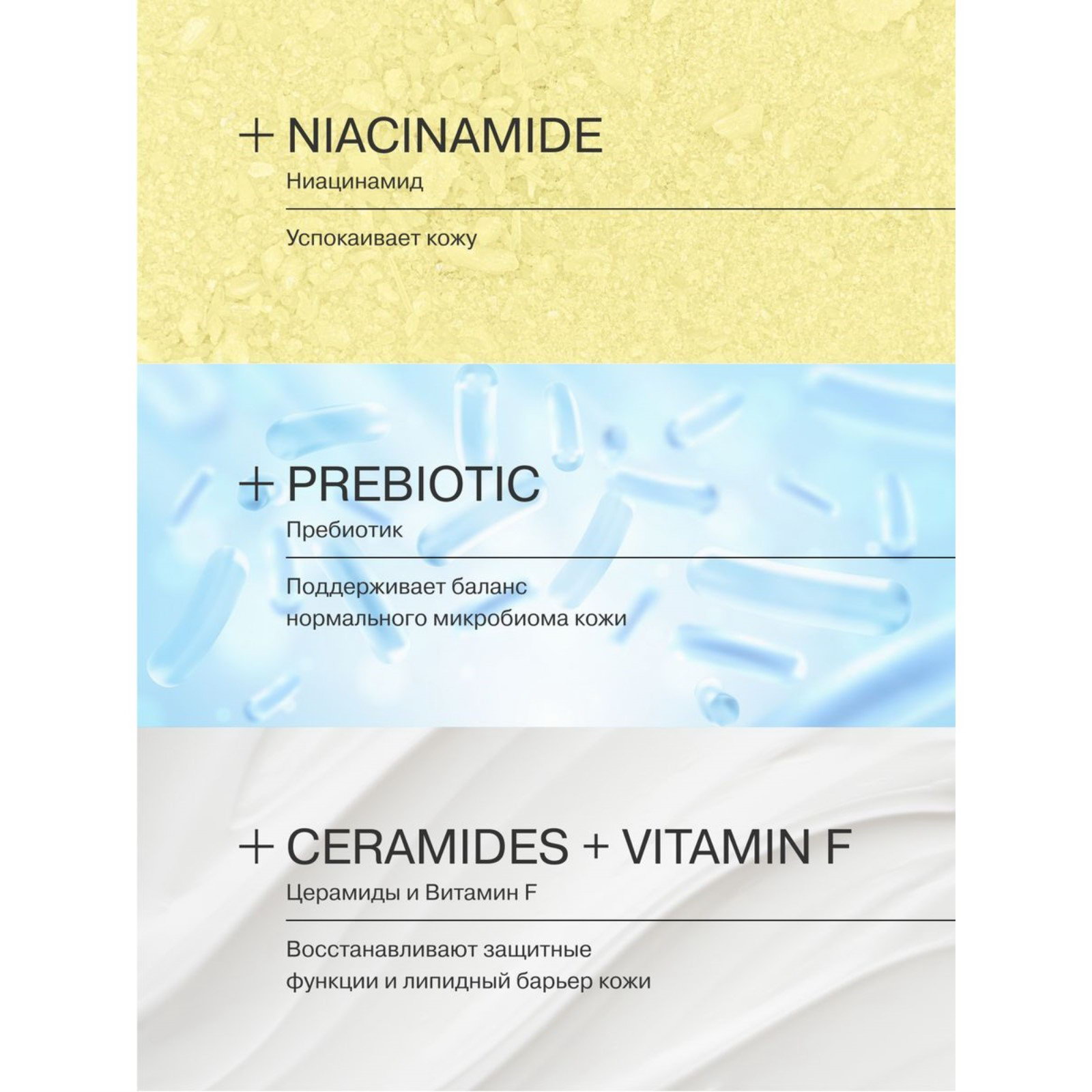 Размер упаковки: 6.3 x 21.5 x 5.7 см. Вес, г/Объём, мл: 400 Вес, г/Объём, мл: 400 tnved: 3304990000 Температурное ограничение: Нет Температурное ограничение: Нет Вид: Молочко Уменьшает покраснение кожи и повышает уровень увлажненности, сохраняющийся 48 часов*. Активные ингредиенты восстанавливают гидролипидный барьер, устраняя чувство стянутости и зуд от сухости, уменьшают шелушение. Благодаря входящему в состав пребиотику регулирует и поддерживает баланс нормального микробиома кожи, способствуя восстановлению ее защитной функции. Содержит физиоадаптированную воду, которая обеспечивает высокую совместимость средства с кожей. *Доказано клиническими исследованиями. | ||