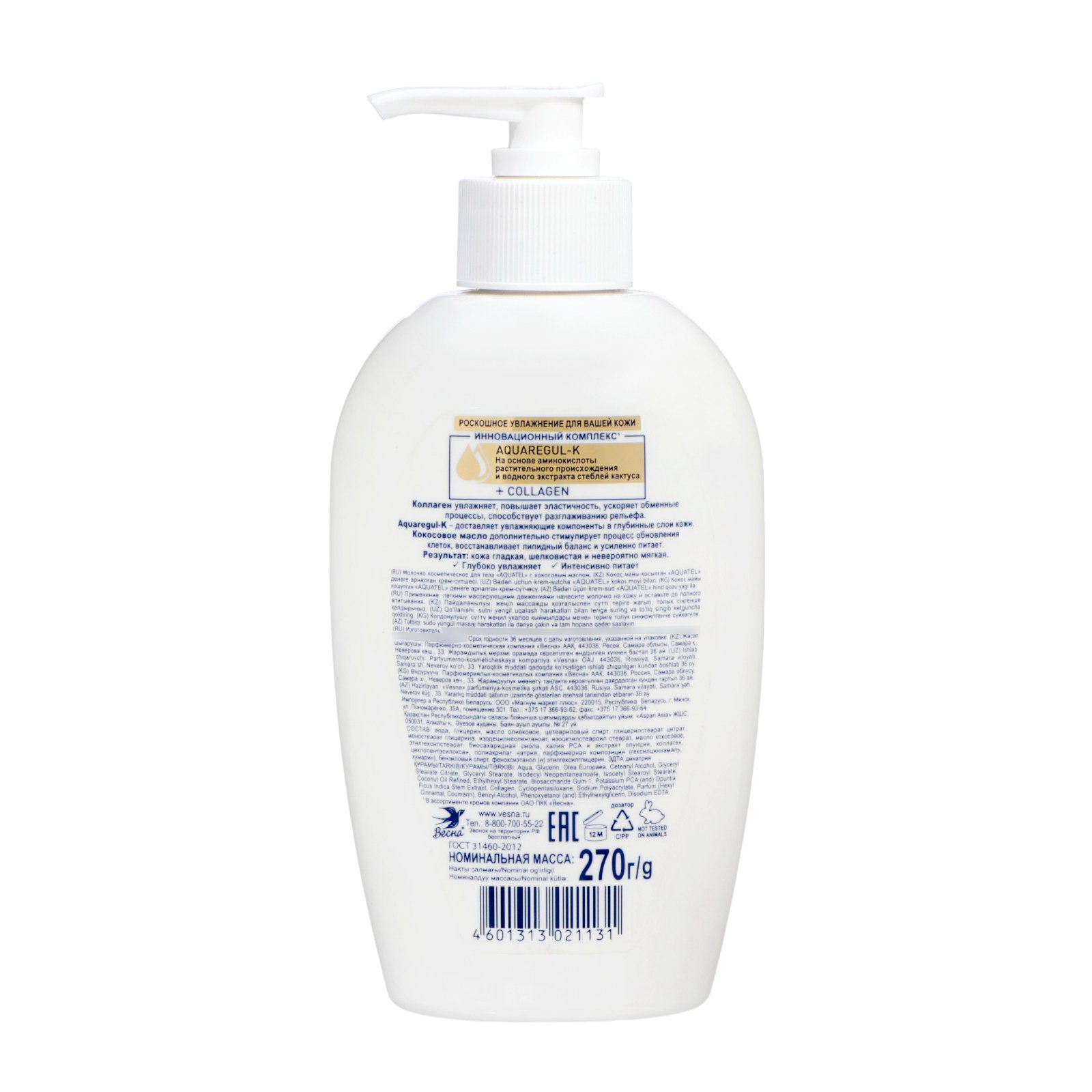 Молочко косметическое для тела с кокосовым маслом, 270 г, 270 мл., Aquatel, Россия