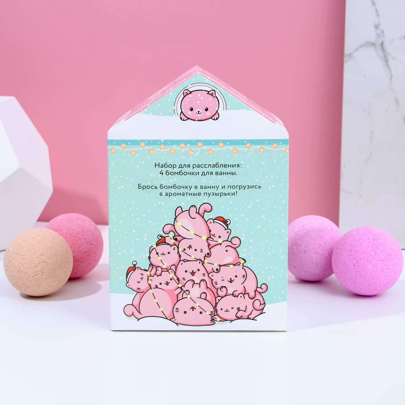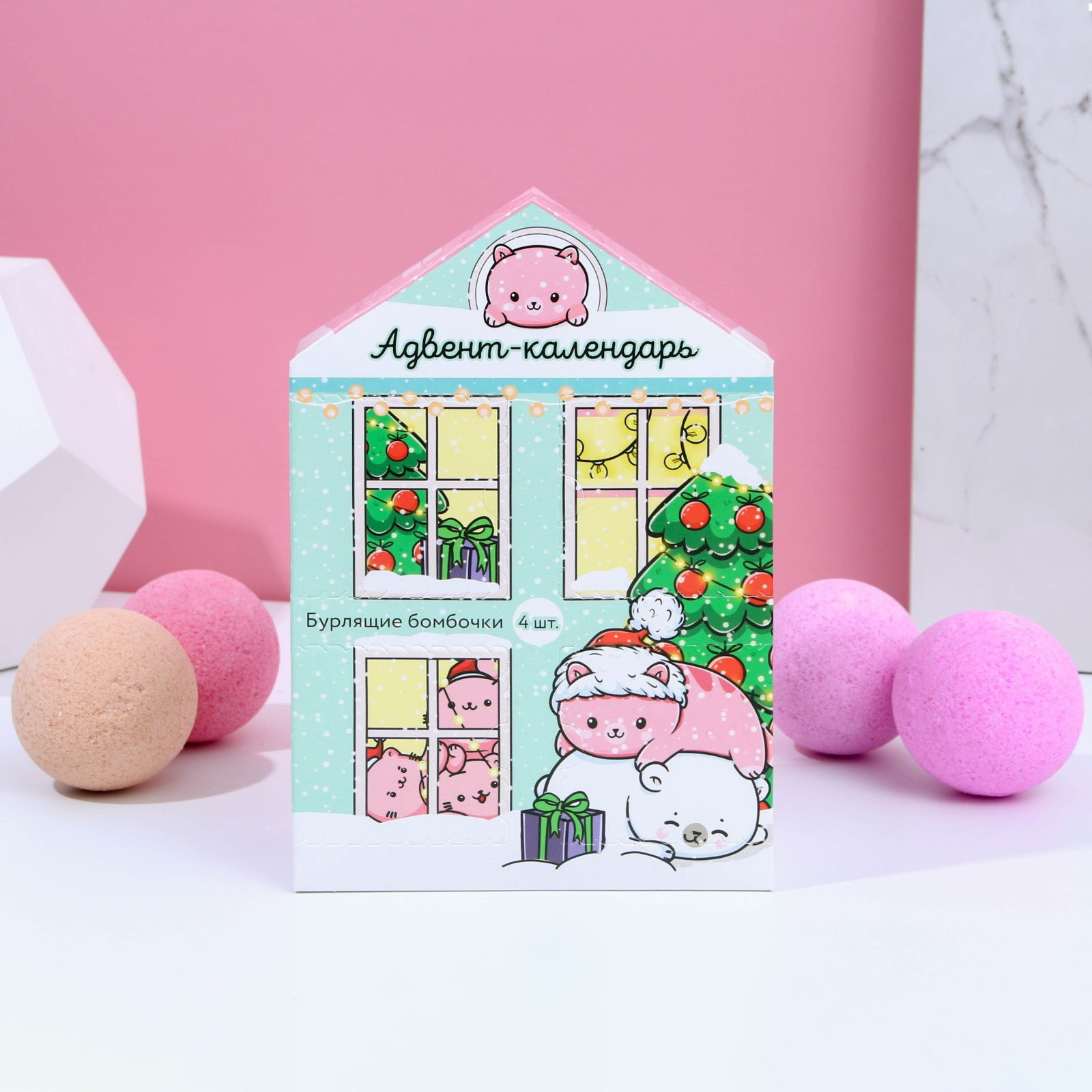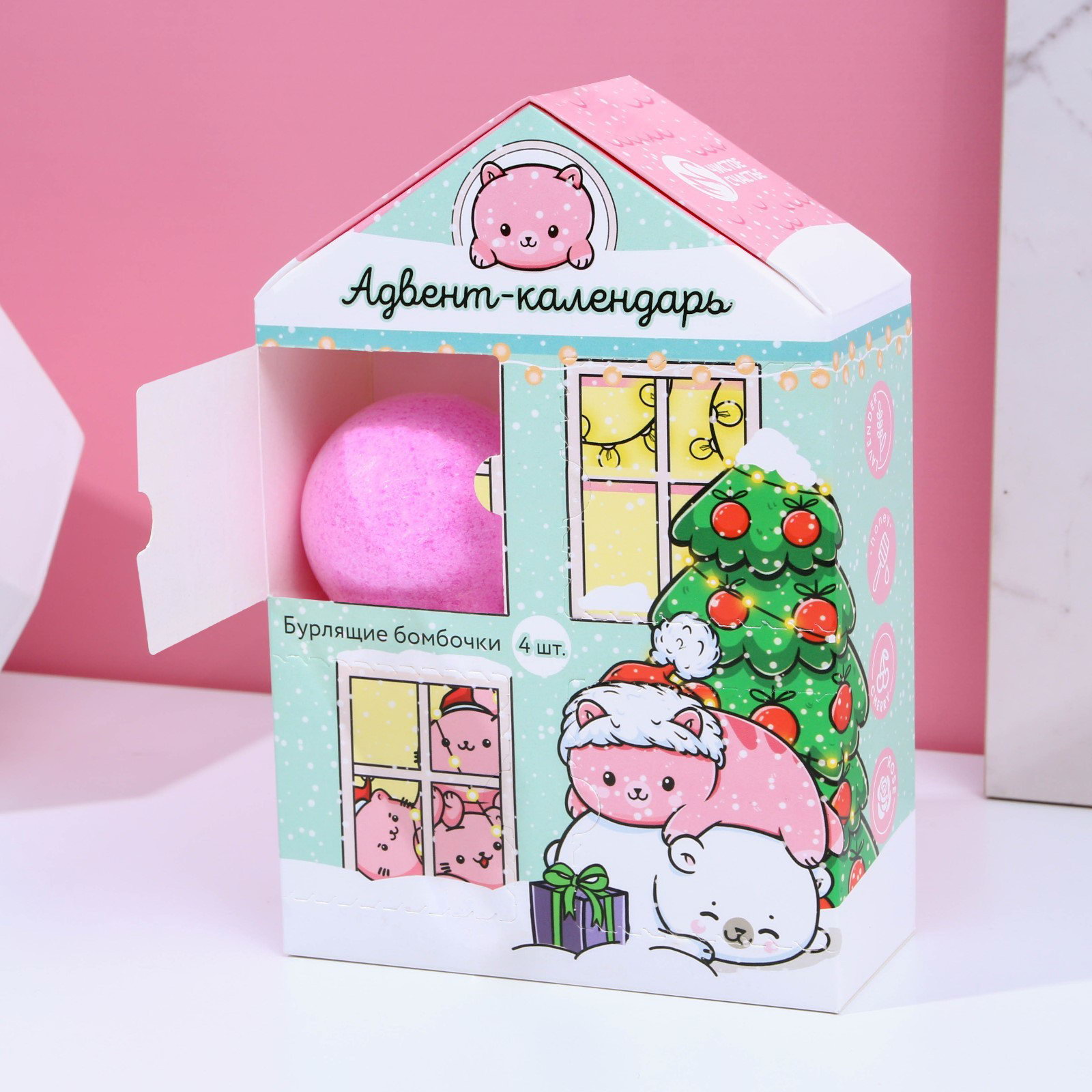 Адвент-календарь "С Новокотием!", бомбочки для ванны 4 шт. по 130 г, ароматы лаванда, мёд, вишня, роза, Чистое счастье, Россия