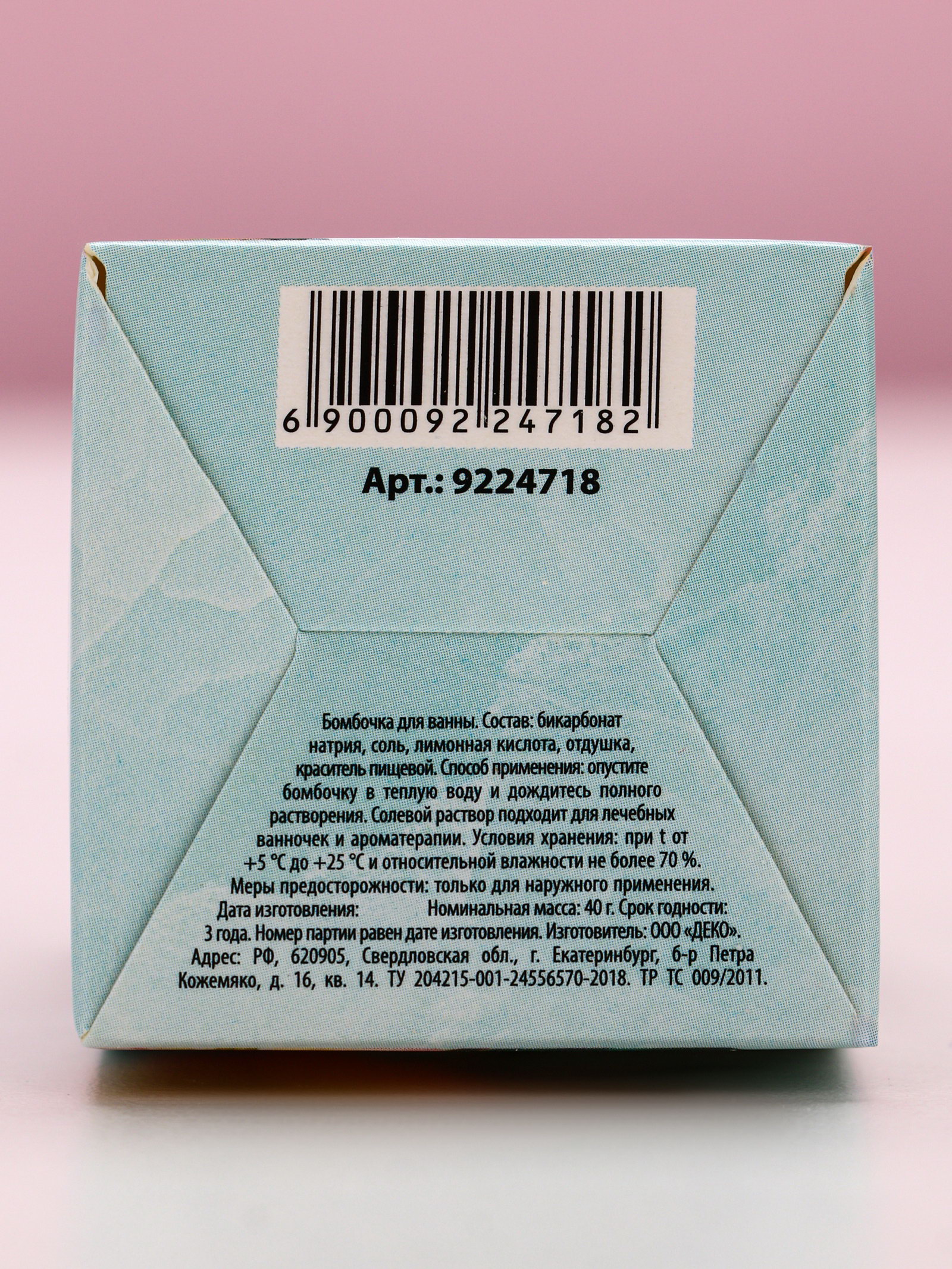 Область применения: Для тела, Для тела Размер упаковки: 4.5 x 7.3 x 4.5 см. Темпер. ограничение НЕ НИЖЕ ℃: +5 Темпер. ограничение НЕ ВЫШЕ ℃: +25 Тематика праздника: 8 Марта Форма: Шар Назначение: Тонизирование Вид: Бомбочка Адресат: Без адресата Адресат: Без адресата tnved: 3307300000 Аромат: Мята Набор: Нет Вес, г: 40 Особенности: Без особенностей Тематика подарка: Уходовая косметика Для кого: Для женщины Возраст: Для взрослых Вид упаковки: Картонная упаковка В наборе, шт.: 1 | ||