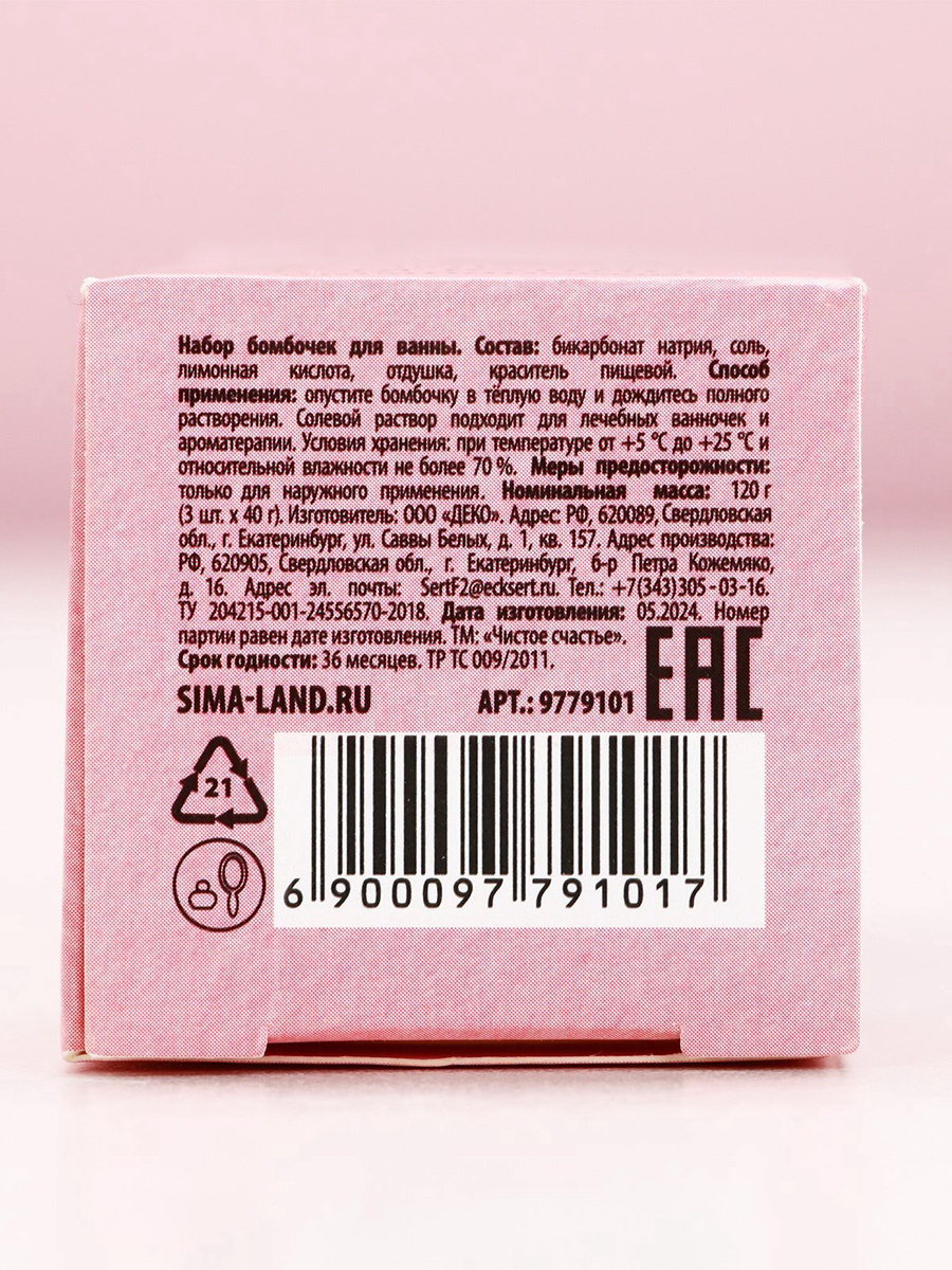 Вид: Бомбочка, Бомбочка для ванн Область применения: Для тела, Для тела Возраст: Взрослый, Для взрослых, Для всех возрастов Размер упаковки: 4.2 x 12.3 x 4.2 см. Назначение: Тонизирование Тематика: Новогодняя Символ года: Нет Цвет: Розовый Адресат: Без адресата Вес, г/Объём, мл: 40 Вес, г: 40 Форма: Шар Вид упаковки: Подарочная коробка Темпер. ограничение НЕ НИЖЕ ℃: +5 Темпер. ограничение НЕ ВЫШЕ ℃: +25 tnved: 3401300000 Составляющие набора: Бомбочка для ванн Аромат: Шампанское Набор: Да Особенности: Без особенностей Тематика праздника: Новый год В наборе, шт.: 3 Тематика подарка: Уходовая косметика Для кого: Для женщины | ||
