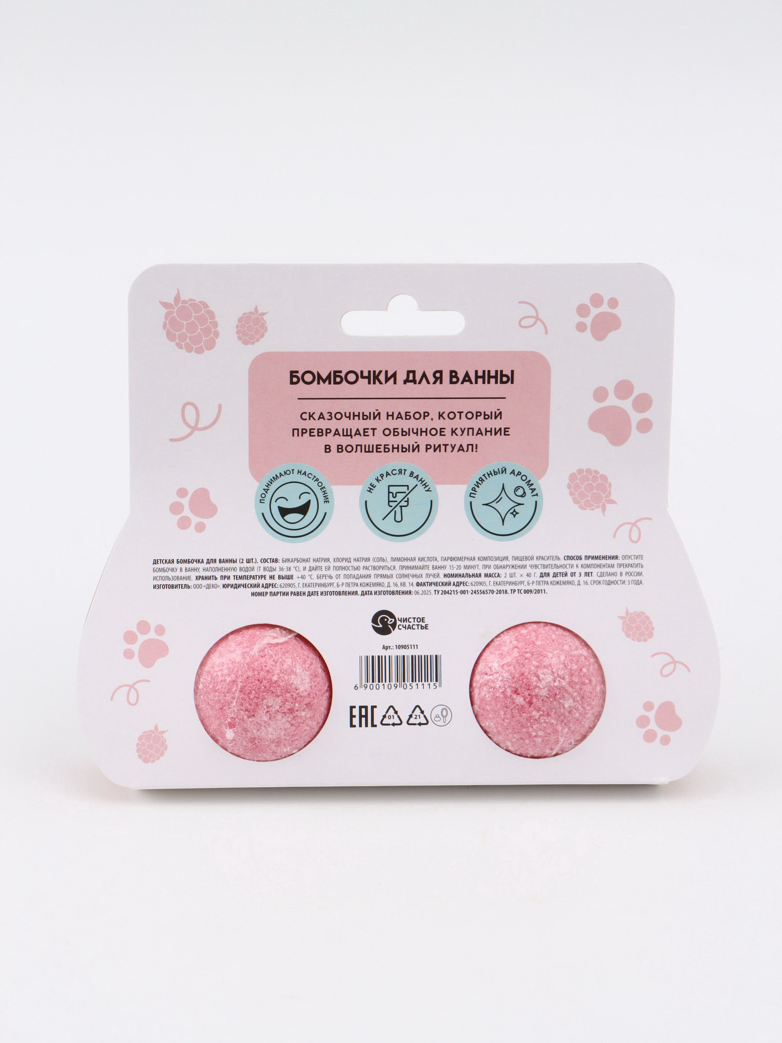 Бомбочки для ванны детские, 2x40 г, аромат малиновый кексик, Кошечка, Чистое счастье, Россия