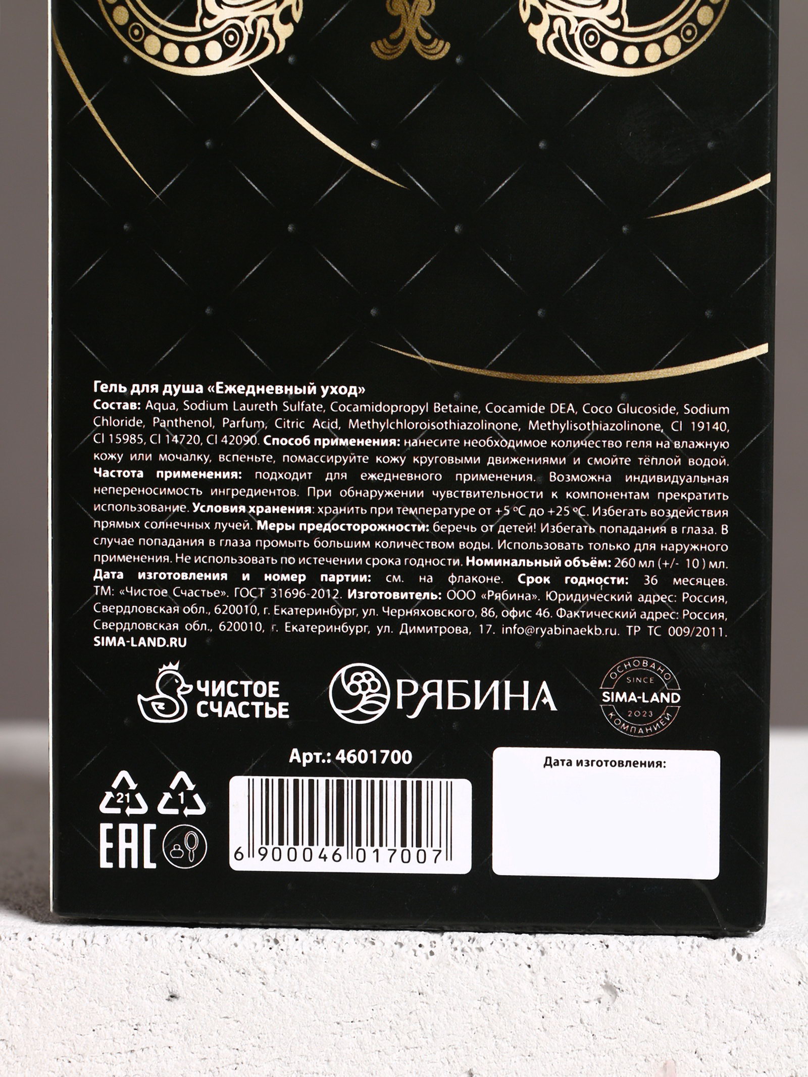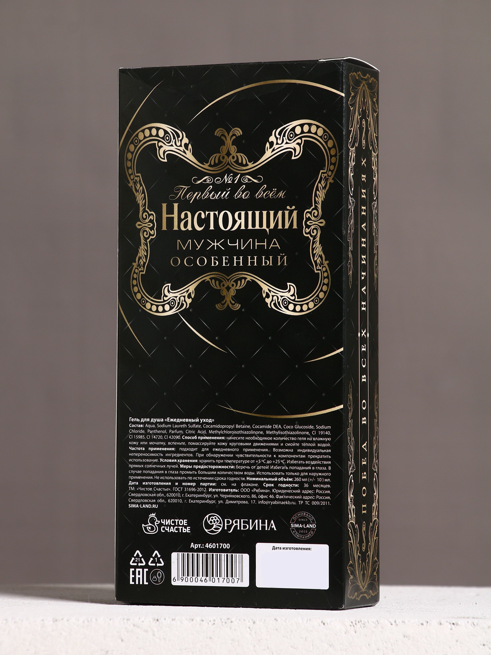 Размер упаковки: 9 x 4 x 20 см. Темпер. ограничение НЕ НИЖЕ ℃: -25 Набор: Нет Возраст: Для взрослых Тематика праздника: Универсальная тематика Назначение: Очищение, детокс Вид: Гель Вид: Гель tnved: 3401300000 Аромат: Парфюм Адресат: Без адресата Температурное ограничение: Да Область применения: Для тела Для кого: Для мужчины Темпер. ограничение НЕ ВЫШЕ ℃: +25 Форма выпуска: Формовые Новогодняя коллекция: Алкоголь Символ года: Нет Запрет реализации по сегментам: 00000000534 СОСТАВ: Aqua, Sodium Laureth Sulfate, Cocamidopropyl Betaine, Sodium Chloride, PEG-4 Rapeseedamide, Cocamidopropylaine Oxide, Polyquaternium-7, Glycerin, Soluble Collagen, Sodium Hyaluronate, Parfum, Methylchloroisothiazolinone, Methylisothiazolinone, Citric Acid, CI 19140, CI 42090, CI 16255. | ||