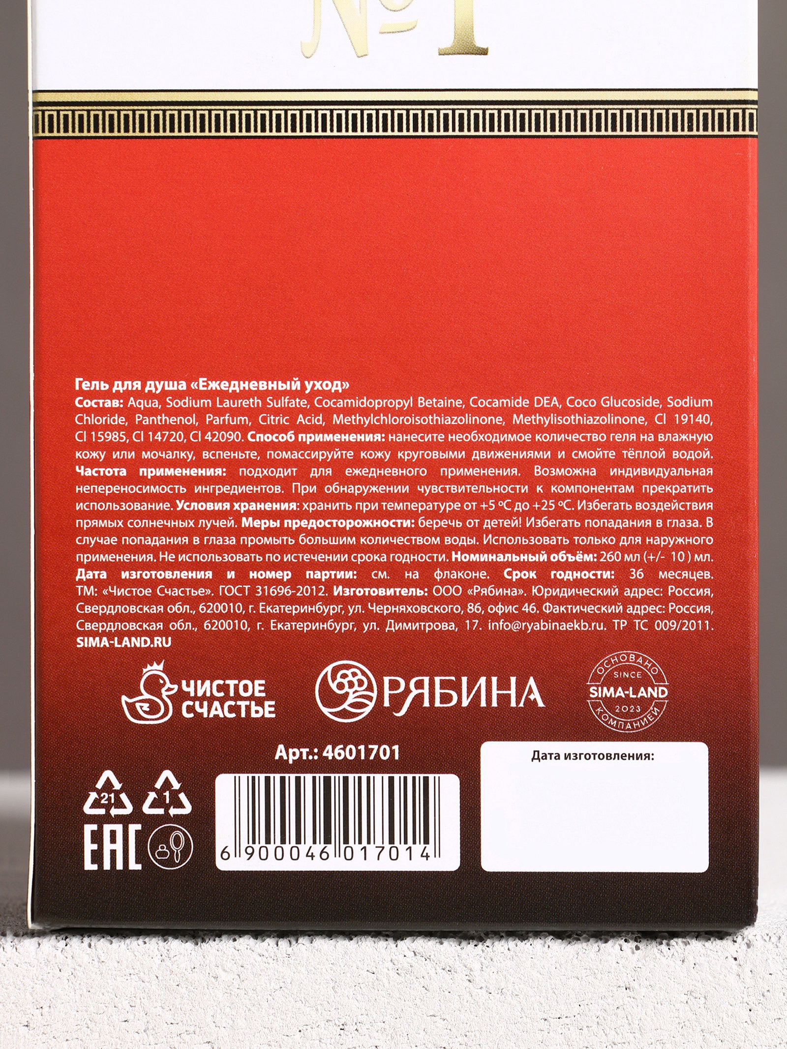 Размер упаковки: 9 x 20 x 4 см. Темпер. ограничение НЕ НИЖЕ ℃: -25 Тематика подарка: Уходовая косметика Вид упаковки: Коробка картонная Возраст: Для взрослых Набор: Нет Тематика праздника: Универсальная тематика Область применения: Для тела Назначение: Очищение, детокс Вид: Гель tnved: 3401300000 tnved: 3401300000 Запрет реализации по сегментам: 00000000534 Температурное ограничение: Нет Адресат: Без адресата Для кого: Для мужчины Аромат: Парфюм Форма выпуска: Формовые СОСТАВ: Aqua, Sodium Laureth Sulfate, Cocamidopropyl Betaine, Sodium Chloride, PEG-4 Rapeseedamide, Cocamidopropylaine Oxide, Polyquaternium-7, Glycerin, Soluble Collagen, Sodium Hyaluronate, Parfum, Methylchloroisothiazolinone, Methylisothiazolinone, Citric Acid, CI 19140, CI 42090, CI 16255. | ||