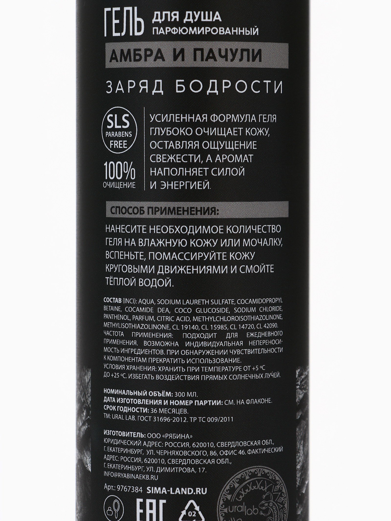 Гель для душа мужской, 300 мл, аромат амбры и пачули, 300 мл., URAL LAB, Россия