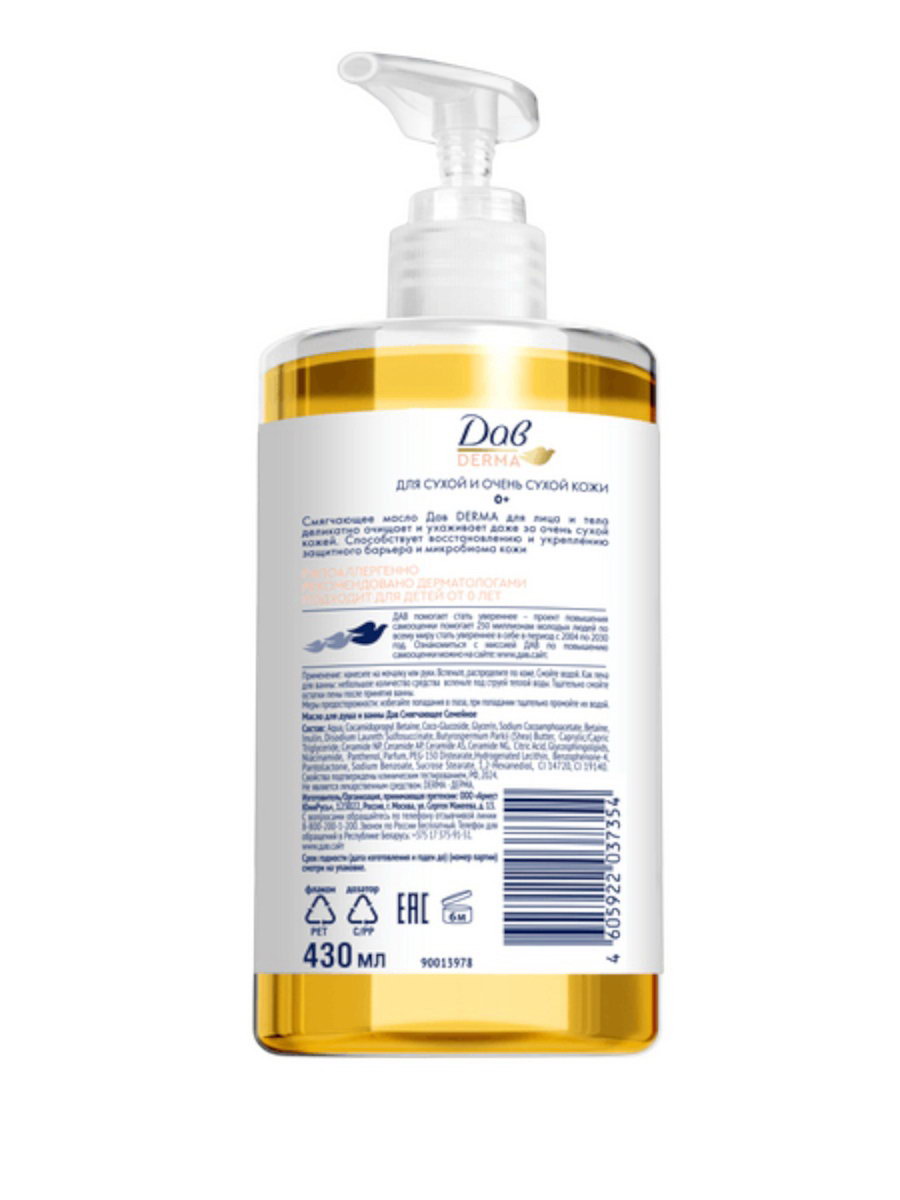Масло для душа и ванны смягчающее, для сухой кожи, для всей семьи, 430 мл, 430 мл., Дав, Россия