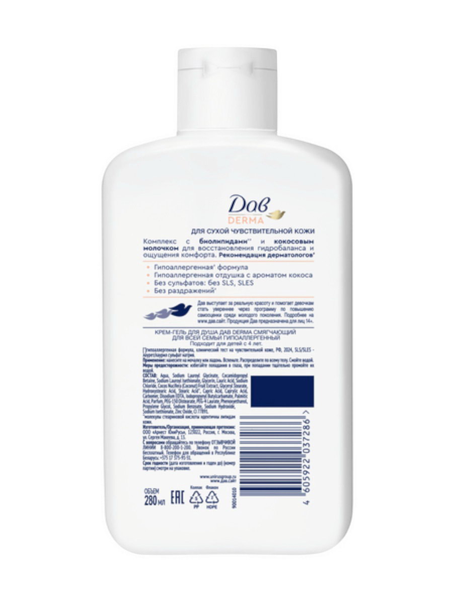 Размер упаковки: 7.5 x 3 x 15 см. tnved: 3401300000 Форма выпуска: Флакон без дозатора Для кого: Унисекс Набор: Нет Температурное ограничение: Нет Аромат: Нейтральный Возраст: Для взрослых Гипоаллергенный смягчающий крем-гель для очень сухой чувствительной кожи Дав Derma – это идеальный выбор для ухода за кожей всей семьи. Уходовый продукт для мытья тела подходит для женщин и мужчин. Гипоаллергенная формула обеспечивает деликатное очищение без раздражений, что делает средство безопасным для детей мальчиков и девочек от 4 лет, а также для подростков. Разработанный с учетом потребностей чувствительной кожи этот питательный гель для душа содержит в составе комплекс с биолипидами и молочком кокоса для восстановления гидробаланса и ощущения комфорта. Способ применения: нанесите на мочалку или ладонь. Вспеньте. Распределите по всему телу. Смойте водой. Состав: Aqua, Sodium Lauroyl Glycinate, Cocamidopropyl Betaine, Sodium Lauroyl Isethionate, Glycerin, Lauric Acid, Sodium Chloride, Cocos Nucifera (Coconut) Fruit Extract, Glyceryl Stearate, Hydroxystearic Acid, Stearic Acid'', Capric Acid, Caprylic Acid, Carbomer, Disodium EDTA, Iodopropynyl Butylcarbamate, Palmitic Acid, Parfum, PEG-150 Distearate, PEG-4 Laurate, Phenoxyethanol, Propylene Glycol, Sodium Benzoate, Sodium Hydroxide, Sodium Isethionate, Zinc Oxide, CI 77891. ''молекулы стеариновой кислоты идентичны липидам кожи. | ||