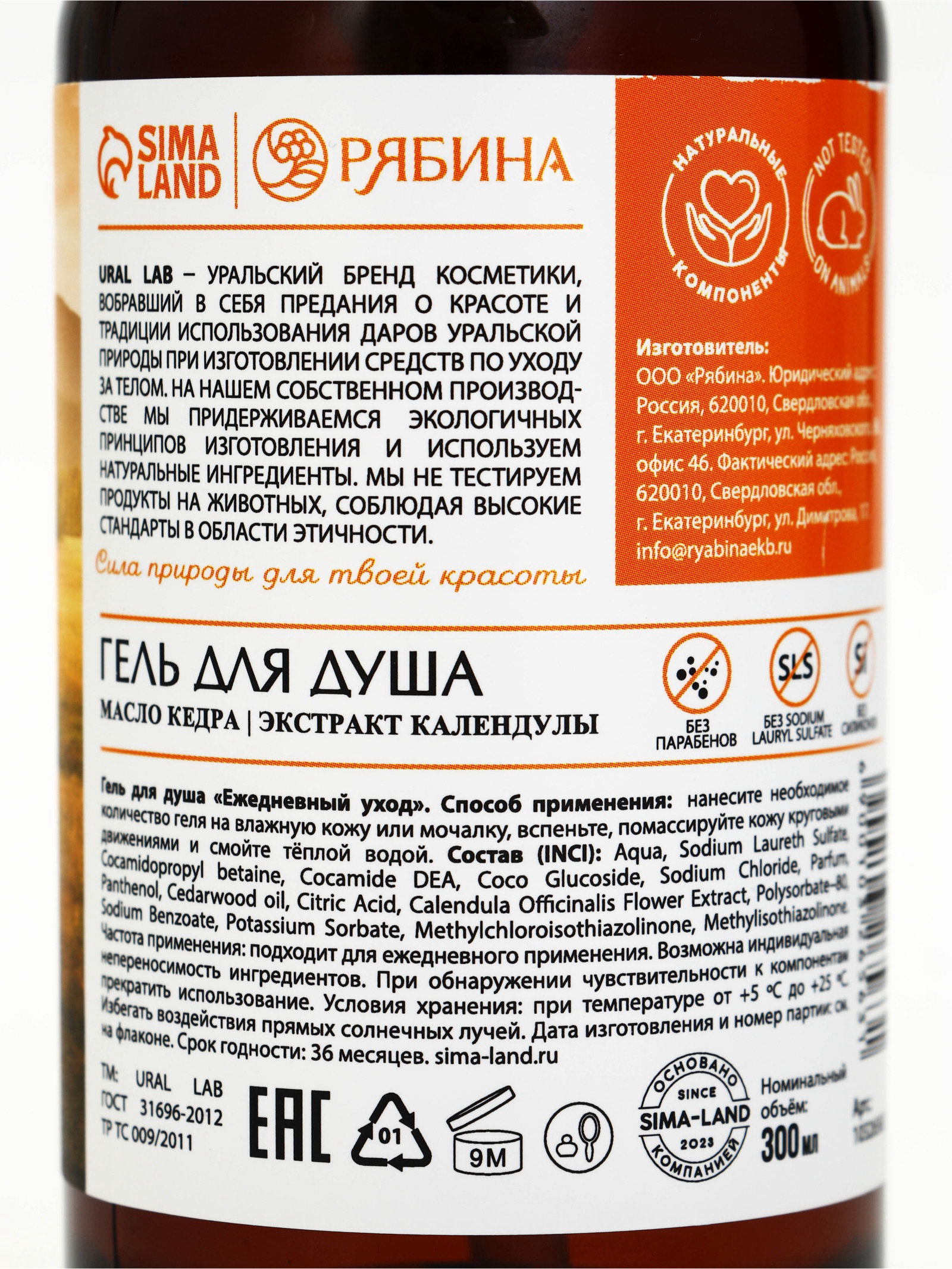 Гель для душа с маслом кедра и экстрактом календулы, 300 мл, 300 мл., URAL LAB, Россия